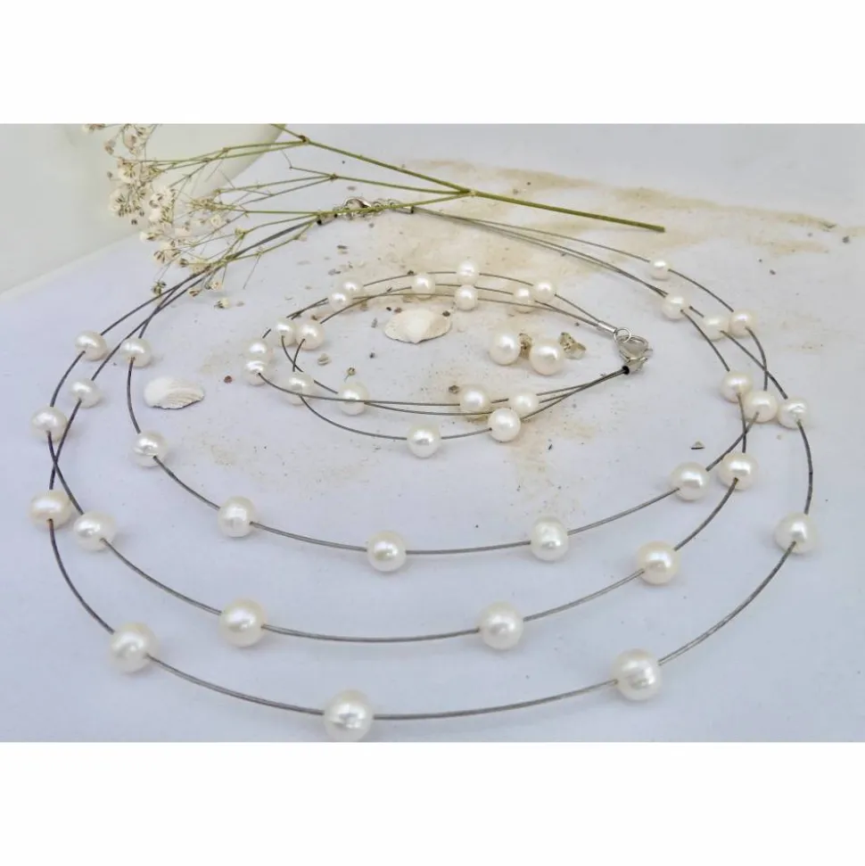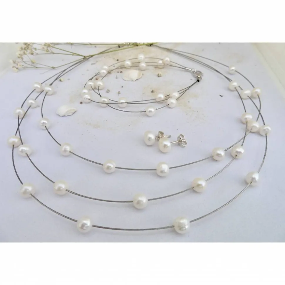 Die Perlenkette besteht aus 3 Reihen schwebender runder weisser Perlen 6-7 mm auf ummanteltem Juwelierdraht mit silbernem Schloß (925er Sterling Silber) mit kleinem Verlängerungskettchen. Die Länge des engsten Strangs ist ca. 44 cm, die anderen liegen angezogen knapp darunter. Bitte geben Sie die gewünschte Länge des kleinsten Stranges angeben, wenn sie anders werden sollte. Die Perlen auf der Kette und dem Armband sind mit Kleber fixiert. Sollte sich mal eine Perle lösen, kann sie leicht wieder mit einem winzigen Tropfen Sekundenkleber fixiert werden.