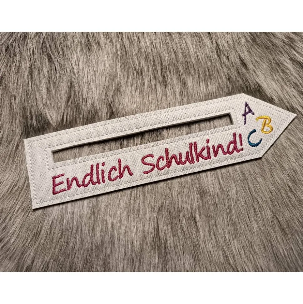 Du kannst die Lesehilfe individuell gestalten lassen: Anstelle von „Endlich Schulkind!“ wird auf Wunsch dein Name oder Kosename gestickt.