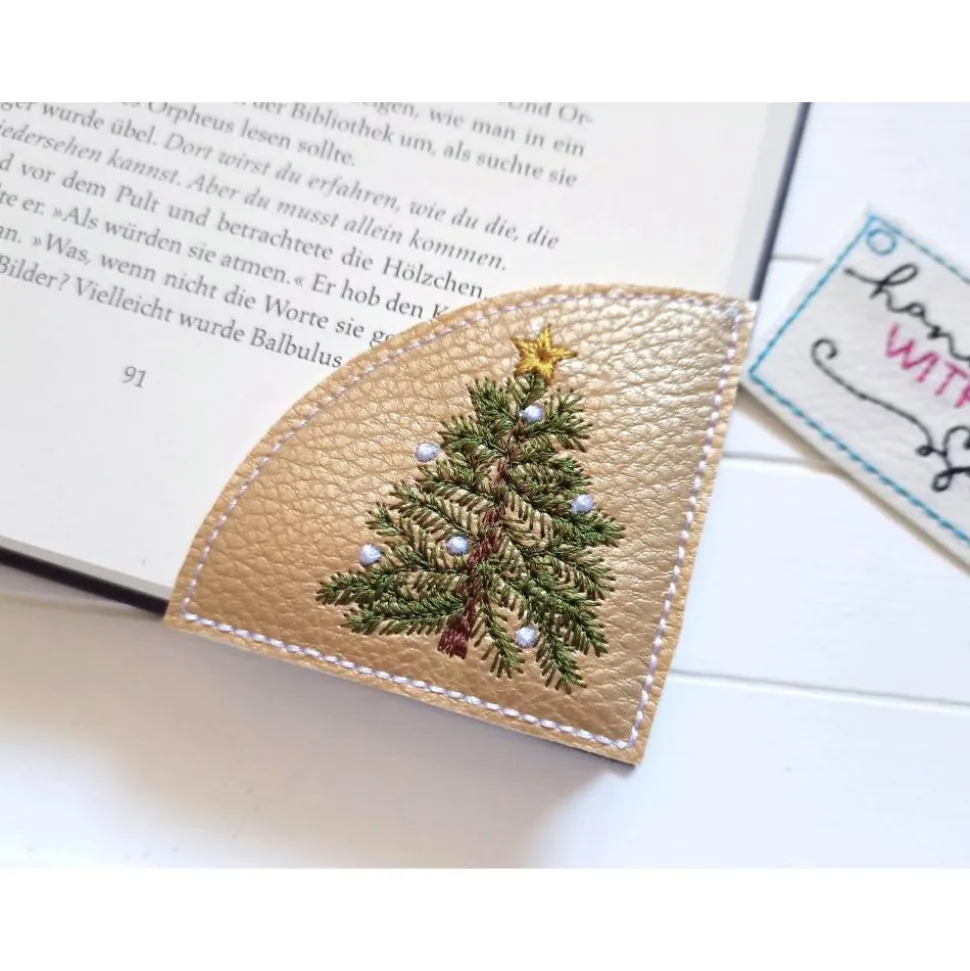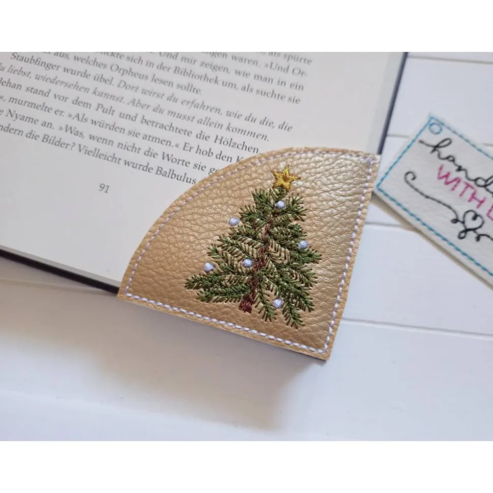 Entdecke das handgemachte Lesezeichen Tannenbaum – ein einzigartiges Accessoire für Deine festliche Leseecke! Das Lesezeichen wurde liebevoll auf veganem, goldfarbenem Kunstleder gestickt und ist ein echter Blickfang für jedes Buch.