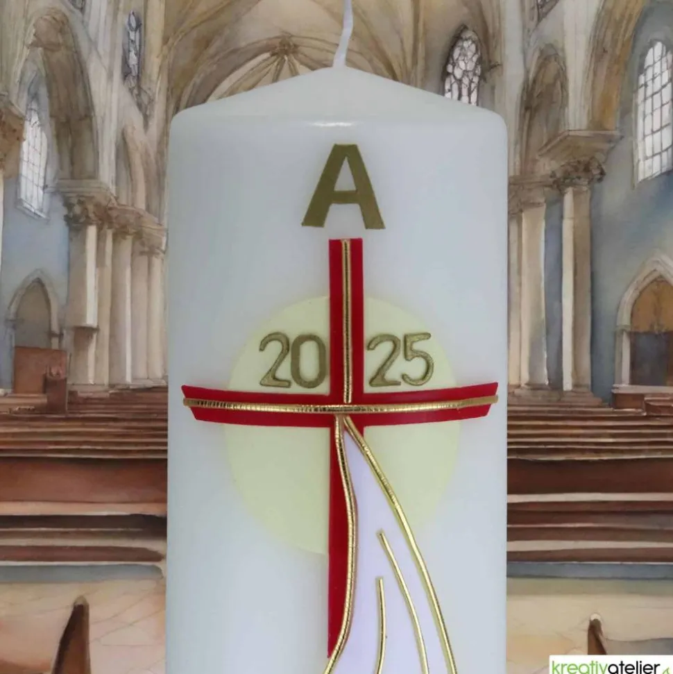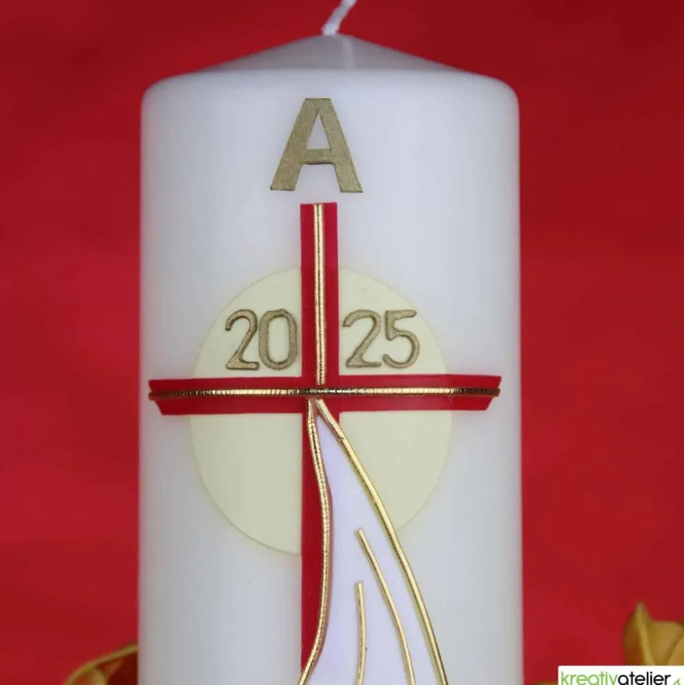 Das goldene Kreuz, das zentral auf der Kerze angeordnet ist, steht für den Glauben und die Erlösung durch Jesus Christus. Es verbindet Himmel und Erde und erinnert uns an das Opfer Christi und seine Auferstehung.