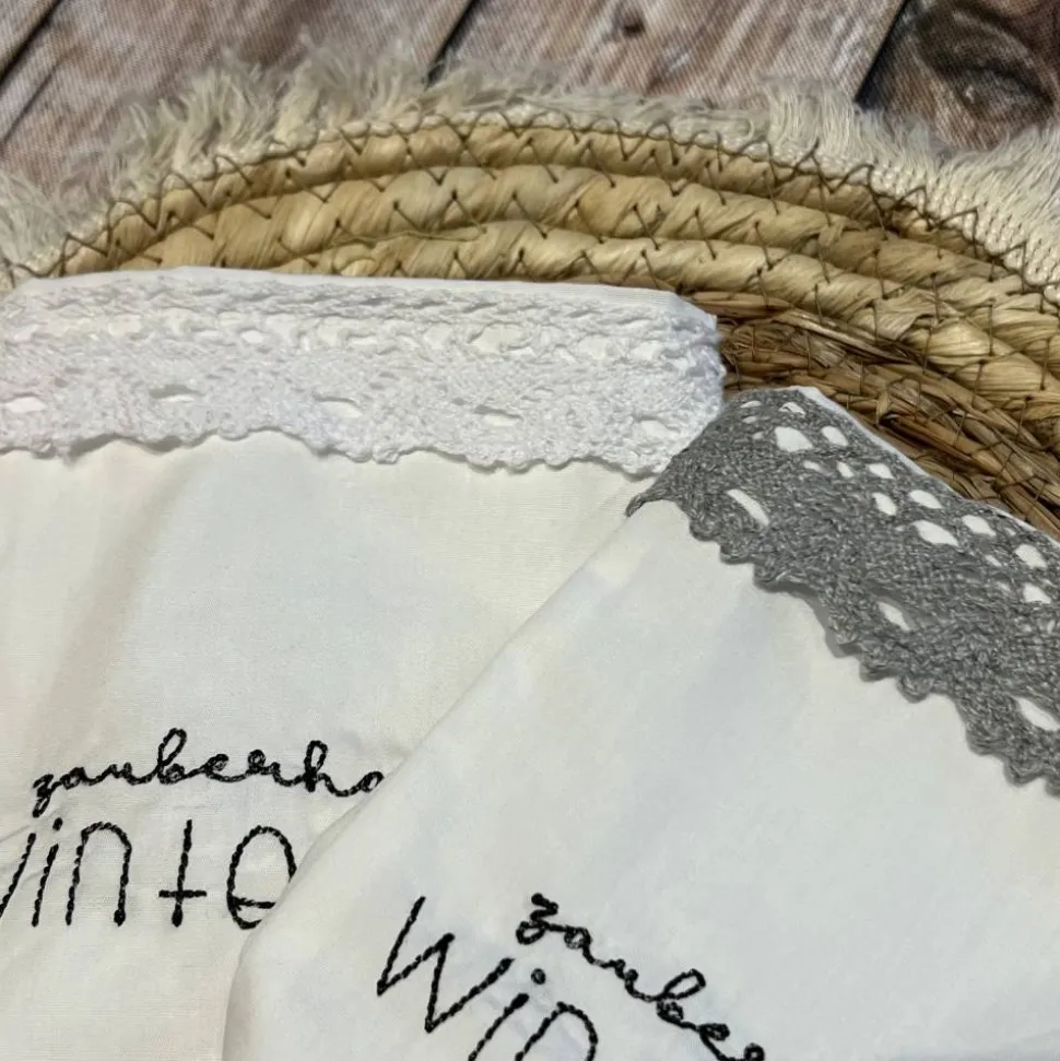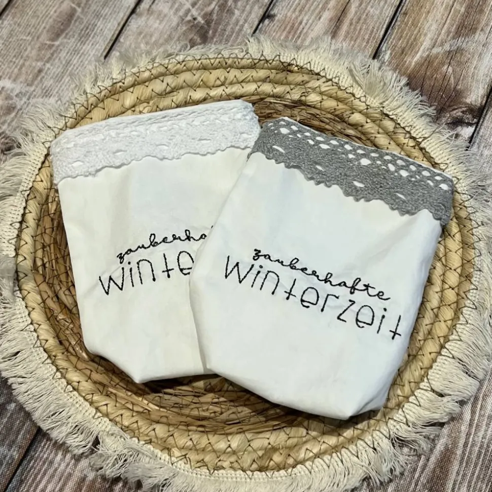 Der Spruch wurde mit der Stickmaschine aufgebracht. Eine Häkelborte am oberen Rand gibt den letzten Schliff.