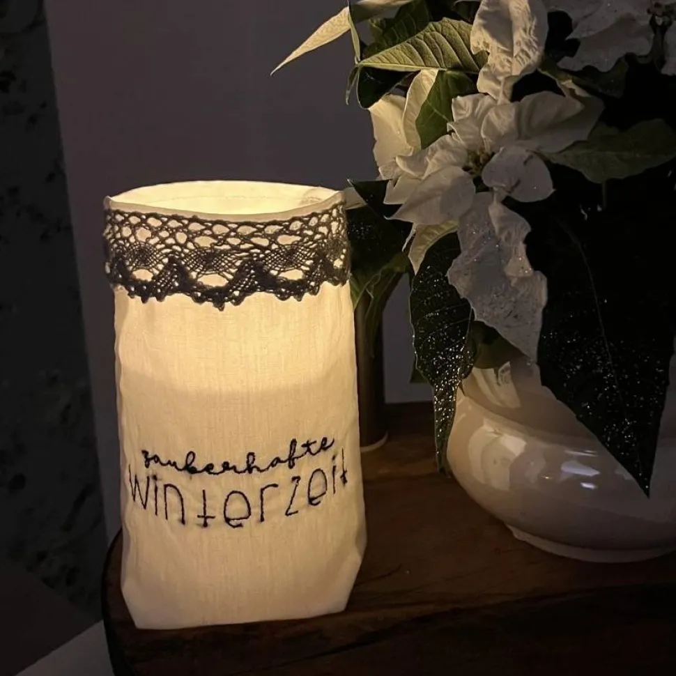 Der kleine Lichterbeutel aus weißer Baumwolle kann mit einem elektrischen Teelicht oder einer Mini-Lichterkette zum Leuchten gebracht werden.