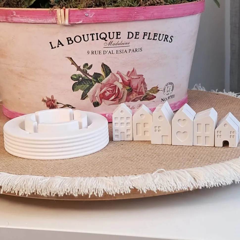 ■ Teelichthalter und Häuschen sind aus weißer Reliefgießmasse von Hand gegossen