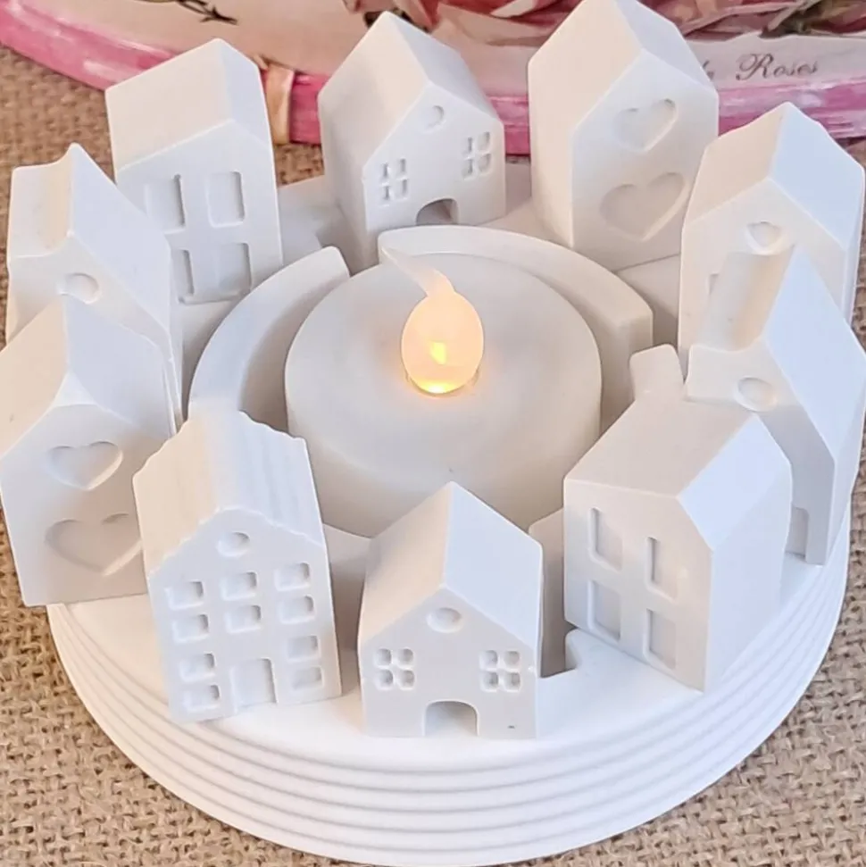 Wunderschöner Kerzenhalter passend für Teelicht, kleine Stumpenkerze oder Motivkerze. Der Teelichthalter wird mit 10 kleinen Häuschen umstellt.