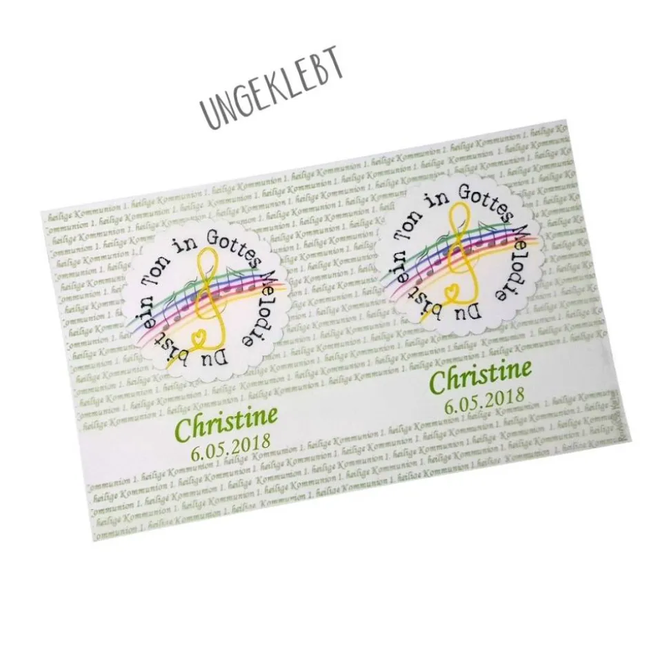 Trage einfach die gewünschte Farbe, den Namen des Kommunionskindes und das Datum der Feier ein. Die Lichthülle wird auf Transparentpapier gedruckt und anschließend fixiert, sodass der Druck wasser- und lichtbeständig ist. Das Motiv ist von beiden Seiten sichtbar und eignet sich daher besonders gut als Tischdeko.