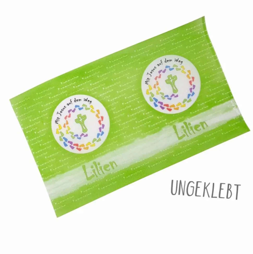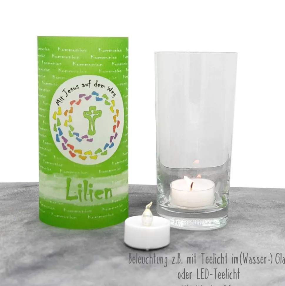 Gestalte deine Kommunionfeier besonders stimmungsvoll mit einer personalisierten Lichthülle aus hochwertigem Transparentpapier – perfekt für das Thema „Mit Jesus auf dem Weg“.