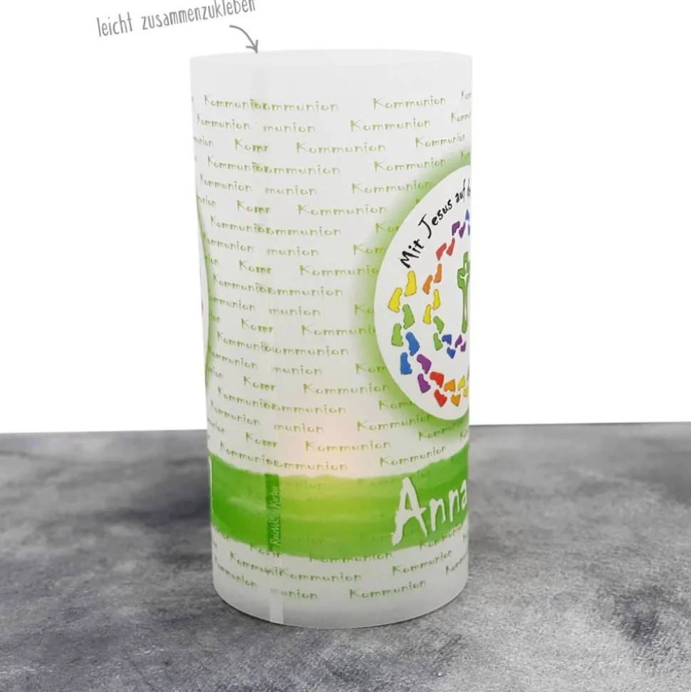 Gestalte Deine Kommunionfeier besonders stimmungsvoll mit der handgemachten Lichthülle „Mit Jesus auf dem Weg“!