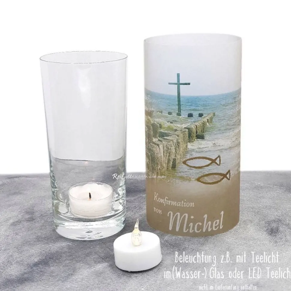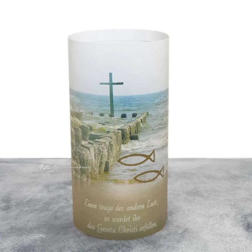 Gestalte deine Feier besonders: Die Lichthülle „Kreuz im Meer“ aus Transparentpapier wird individuell mit deinem Wunsch-Spruch bedruckt!