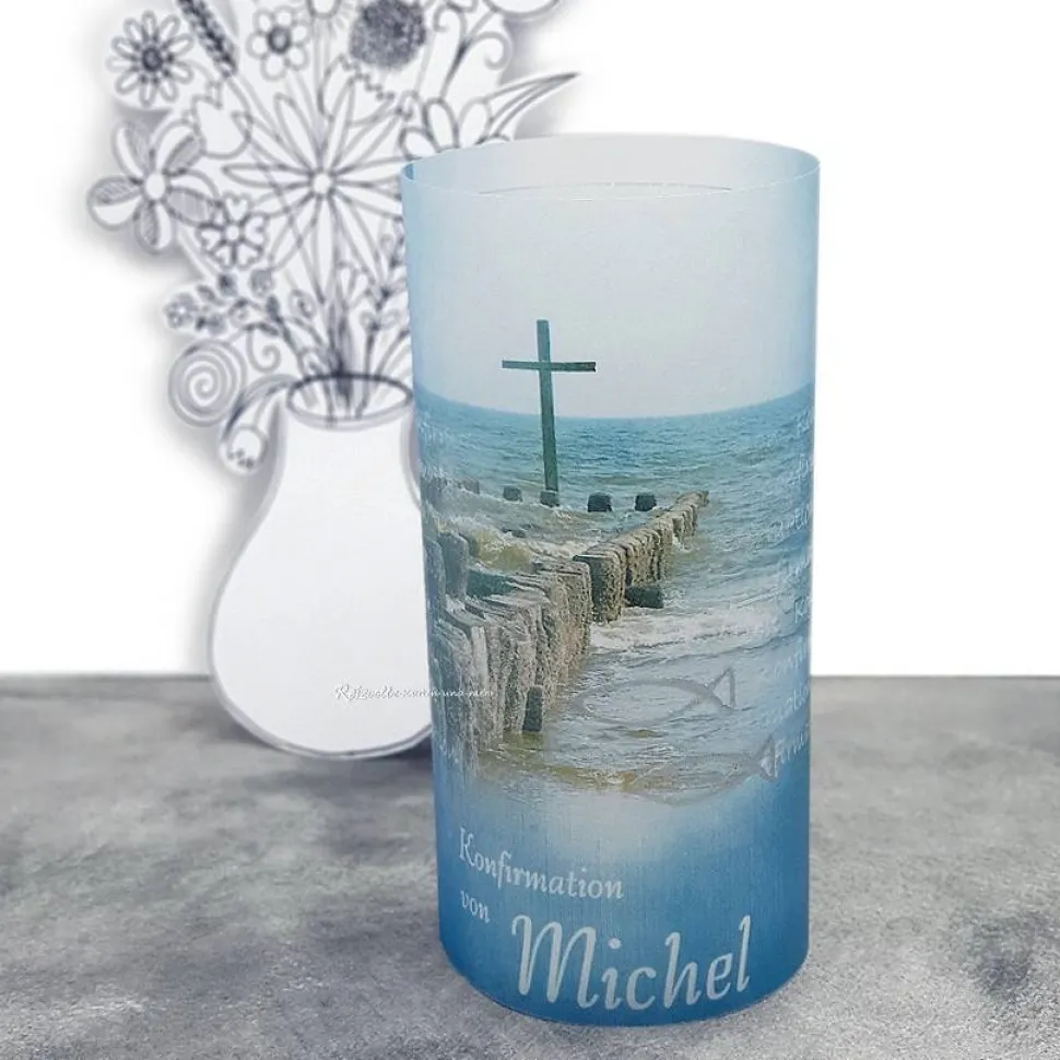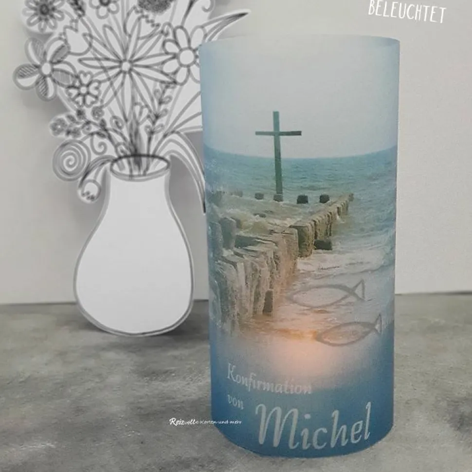 Entdecke die einzigartige Lichthülle aus Transparentpapier für Konfirmation, Kommunion oder Firmung im Design „Kreuz im Meer“.