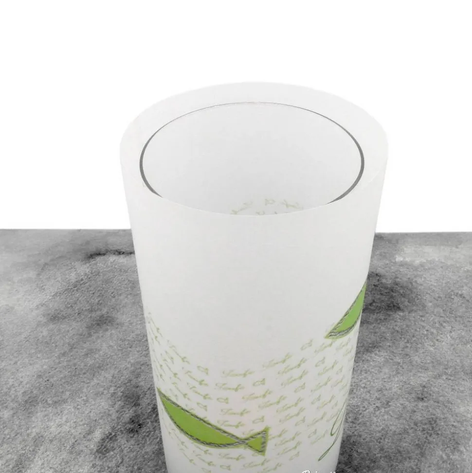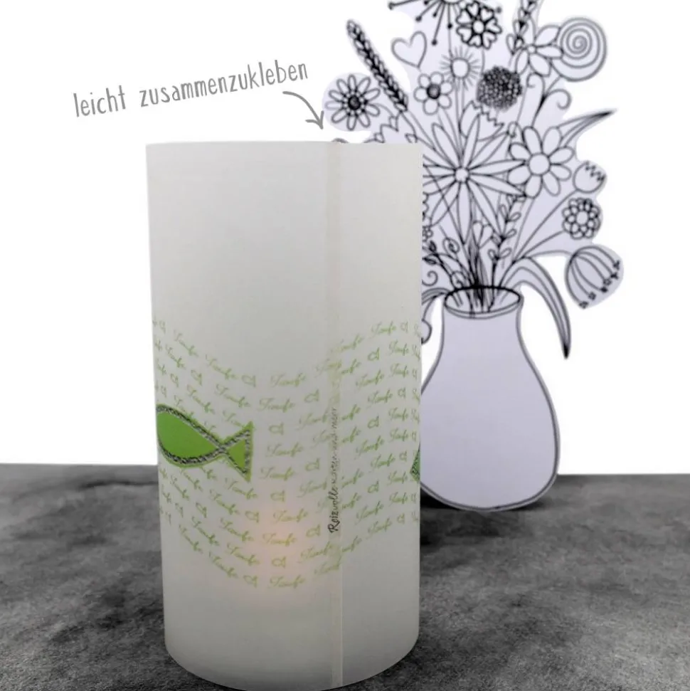 Die Lichthülle wird ungeklebt, aber bereits mit dünnem Doppelklebeband versehen geliefert. So kannst Du sie mit wenigen Handgriffen selbst zusammenkleben. Glas und Leuchtmittel sind nicht dabei – nutze zur Sicherheit Teelichter nur in hohen Gläsern (z.B. leere Senfgläser) oder greife auf LED-Teelichter zurück.