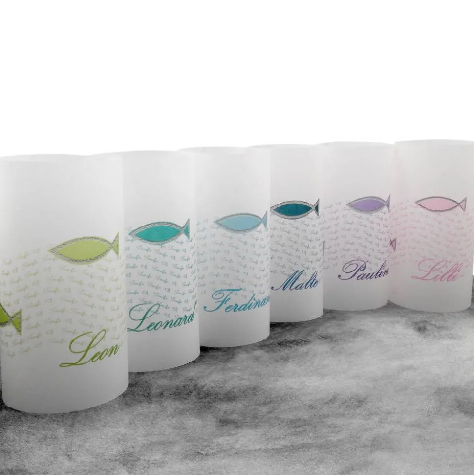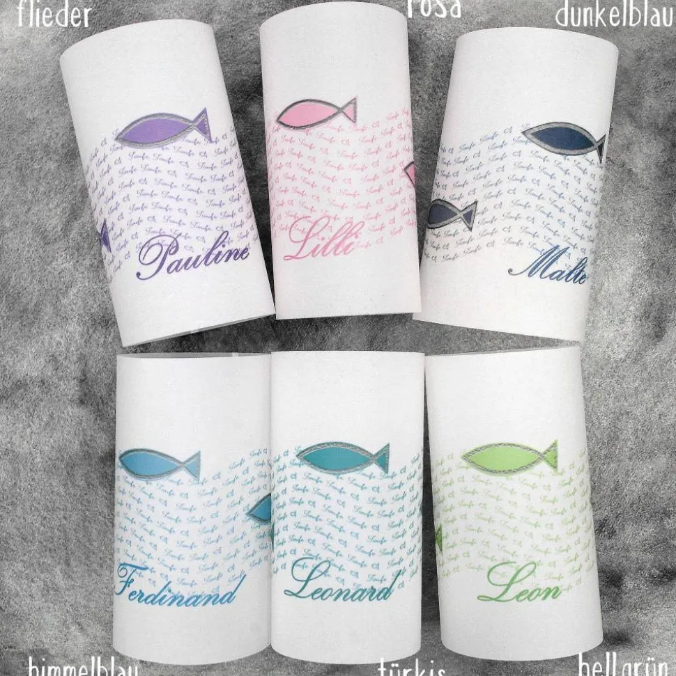 Die Lichthülle zur Taufe mit bunte Fischen ist aus Transparentpapier gefertigt und zum einfachen Zusammenkleben vorbereitet. Die bunten Fische sind direkt aufgedruckt.