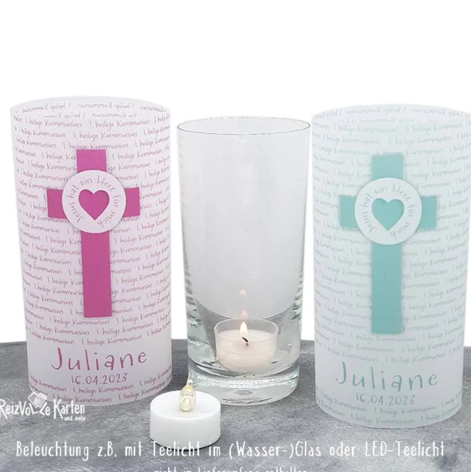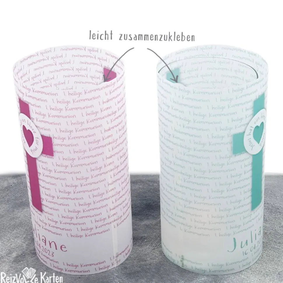 Trage oben den Namen des Kommunionskindes, das Datum der Feier und deine Wunschfarbe ein und erhalte eine individuell gedruckte Lichthülle. Der Druck auf Transparentpapier wird anschließend fixiert und ist dadurch wasser- und lichtbeständig.