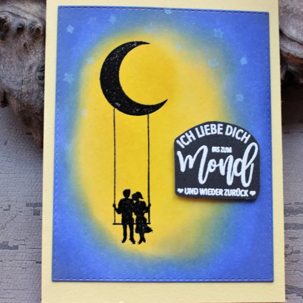 Ich habe dafür Cardstock in den Farben gelb und marineblau selbst eingefärbt. Das tolle Motiv des Liebespaares auf einer Schaukel habe ich in Embossingtechnik gestaltet, ebenso den Spruch in weiß auf schwarzem Cardstock.