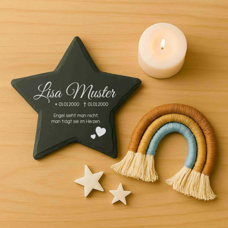 Persönliches Erinnerungsstück: Die langlebige Gravur macht die Schieferplatte zum idealen Grabstein oder Gedenkstein für dein Sternenkind. Deine Wünsche stehen bei uns im Mittelpunkt – wir setzen jeden Auftrag mit viel Herz und Sorgfalt um.