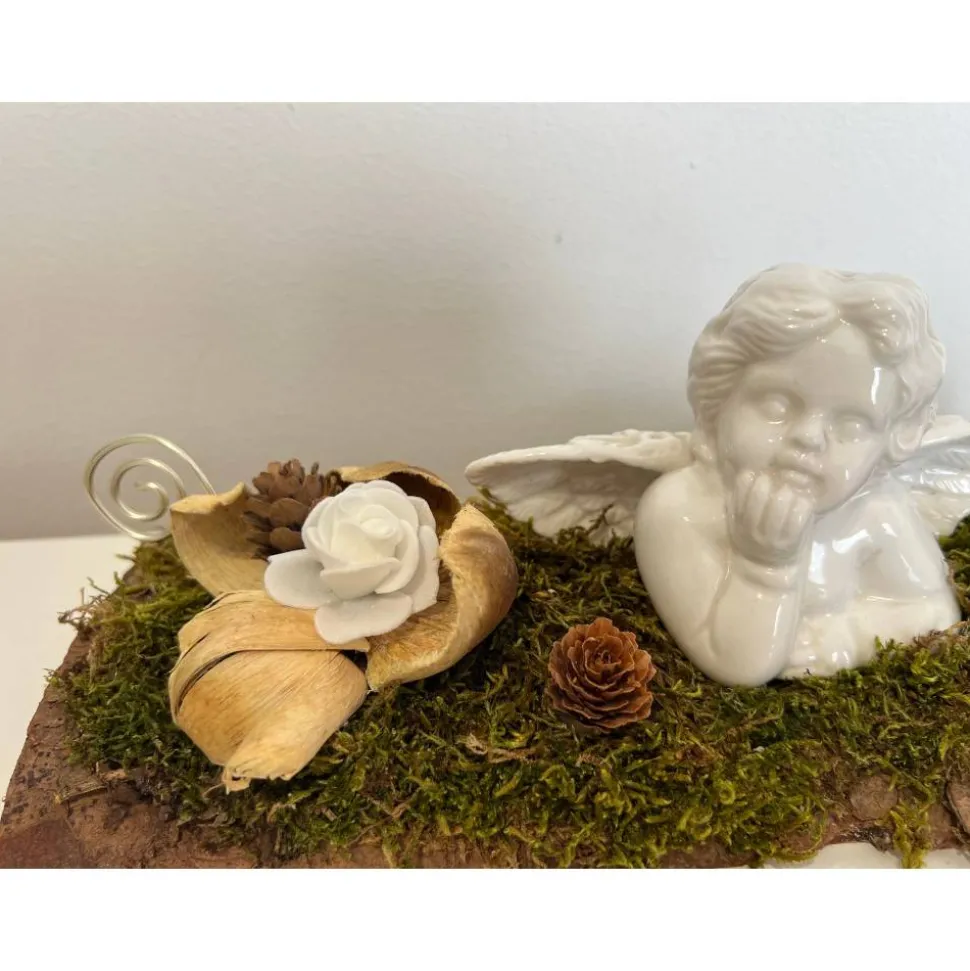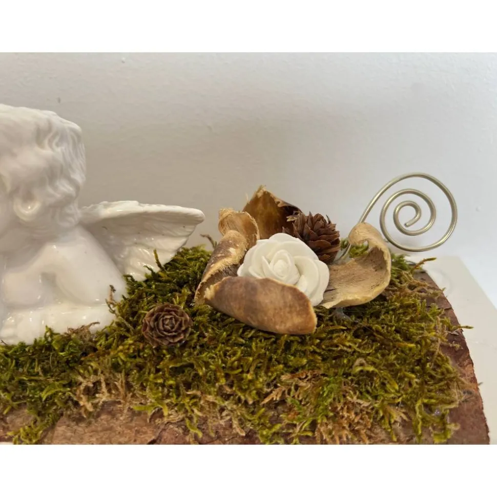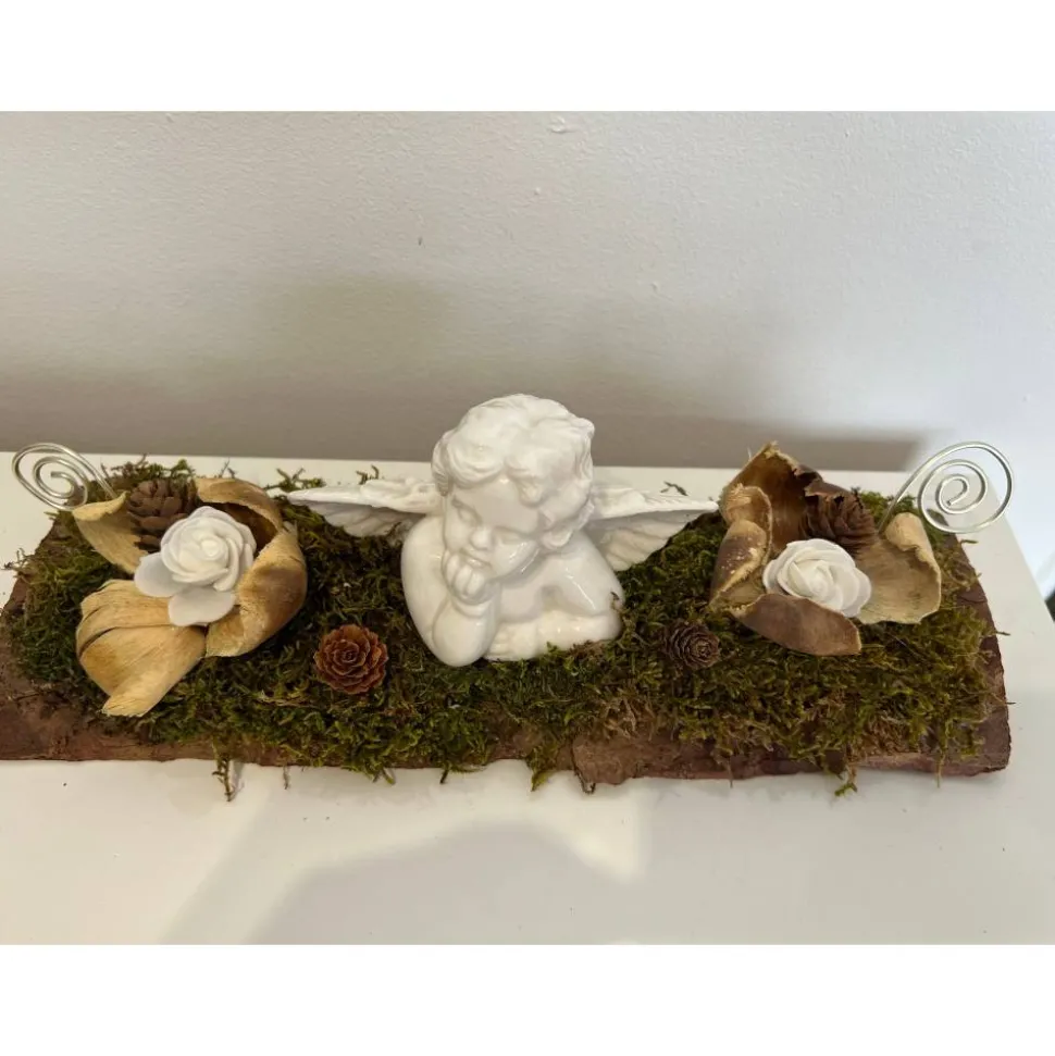 Es besteht aus einem Engel, getrockneten Moos und weiteren Dekoelementen.