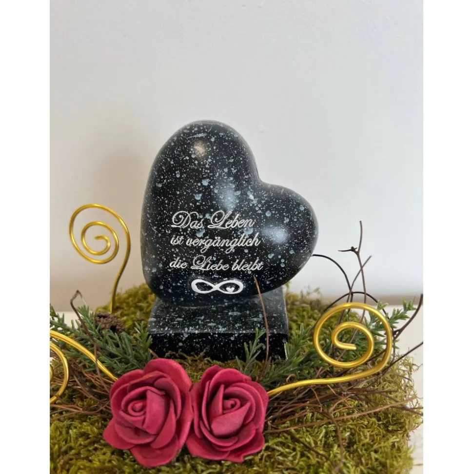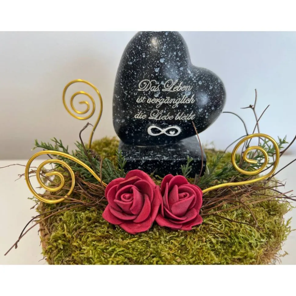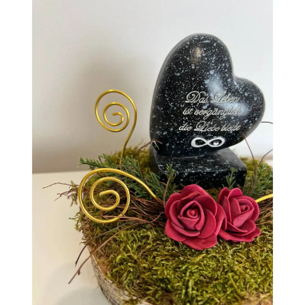 Es besteht aus einem Herz, künstliche Blumen, getrockneten Moos und weiteren Dekoelementen.
