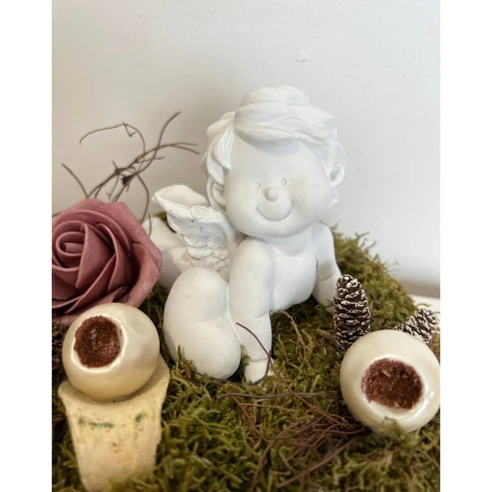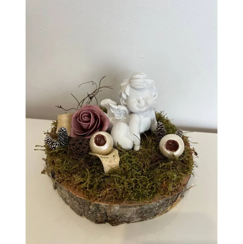 Es besteht aus einem Engel, künstliche Blumen, getrockneten Moos und weiteren Dekoelementen.