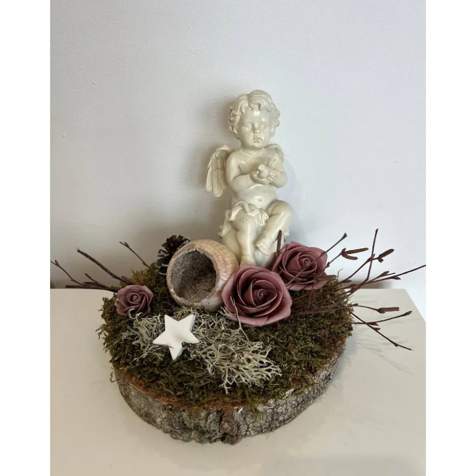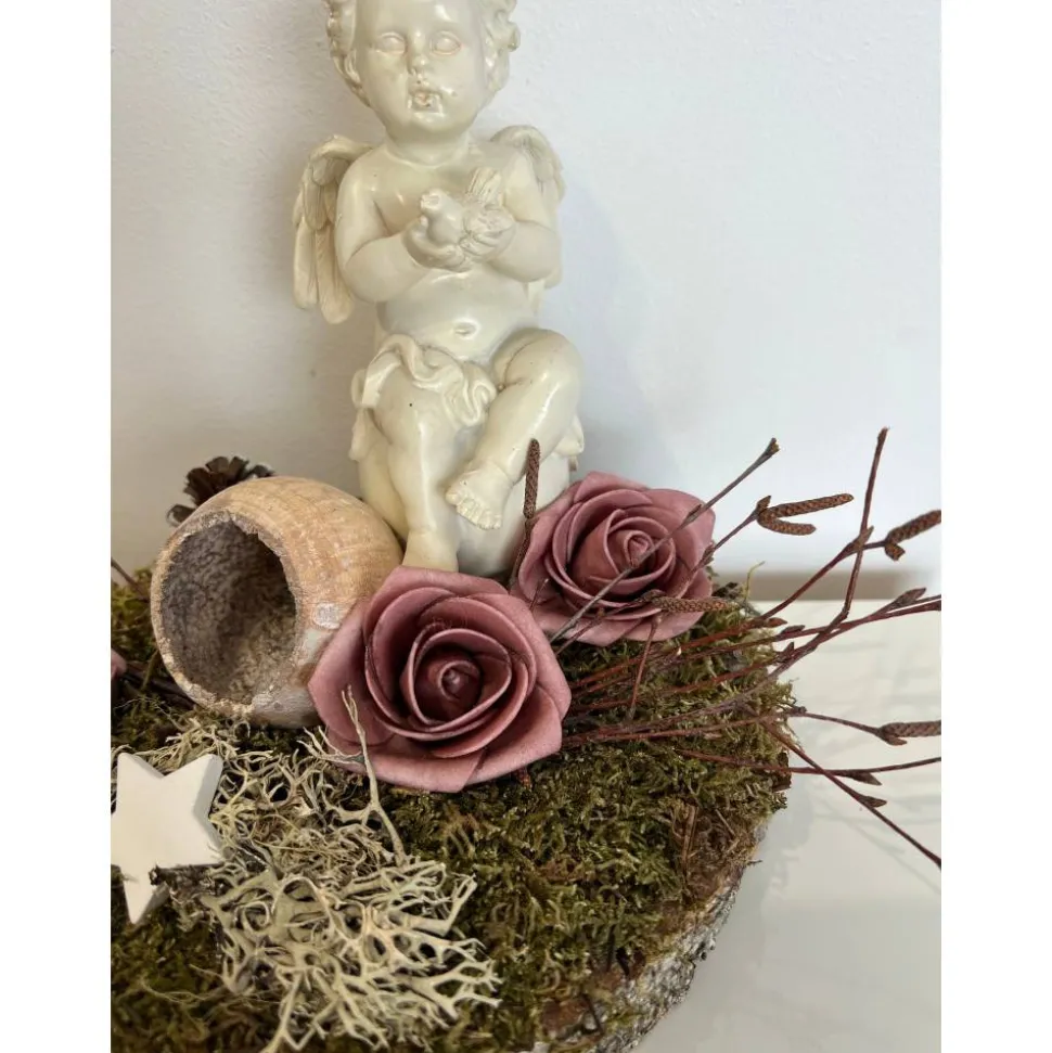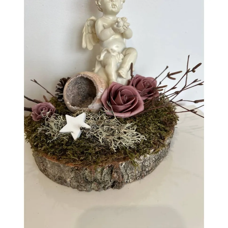 Es besteht aus einem Engel, Blumen, getrockneten Moos und weiteren Naturprodukten.