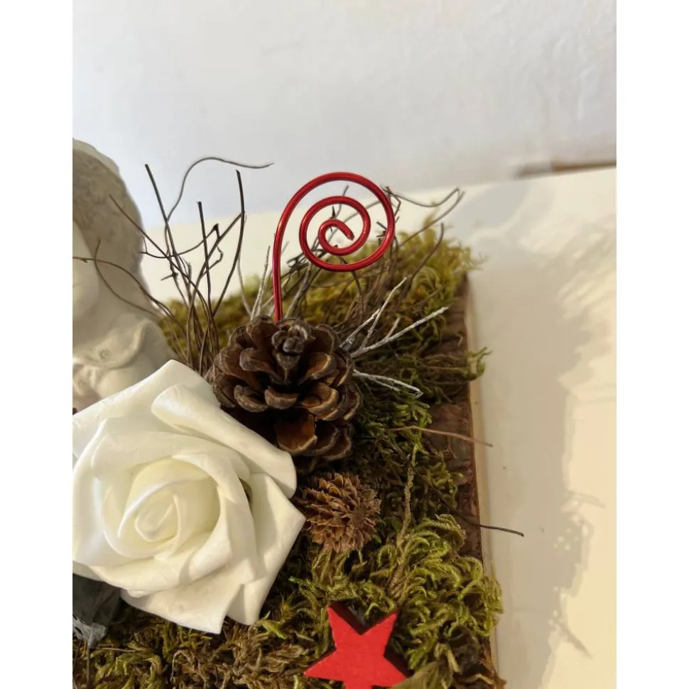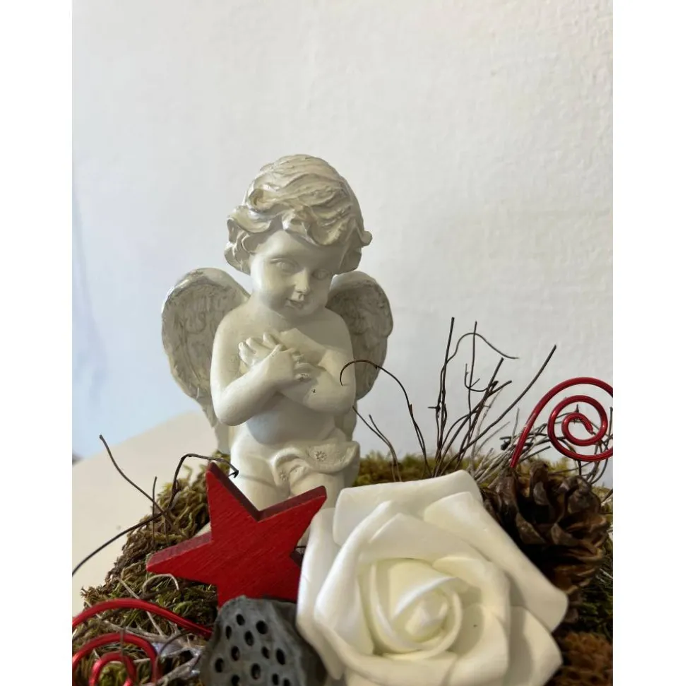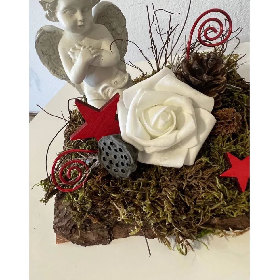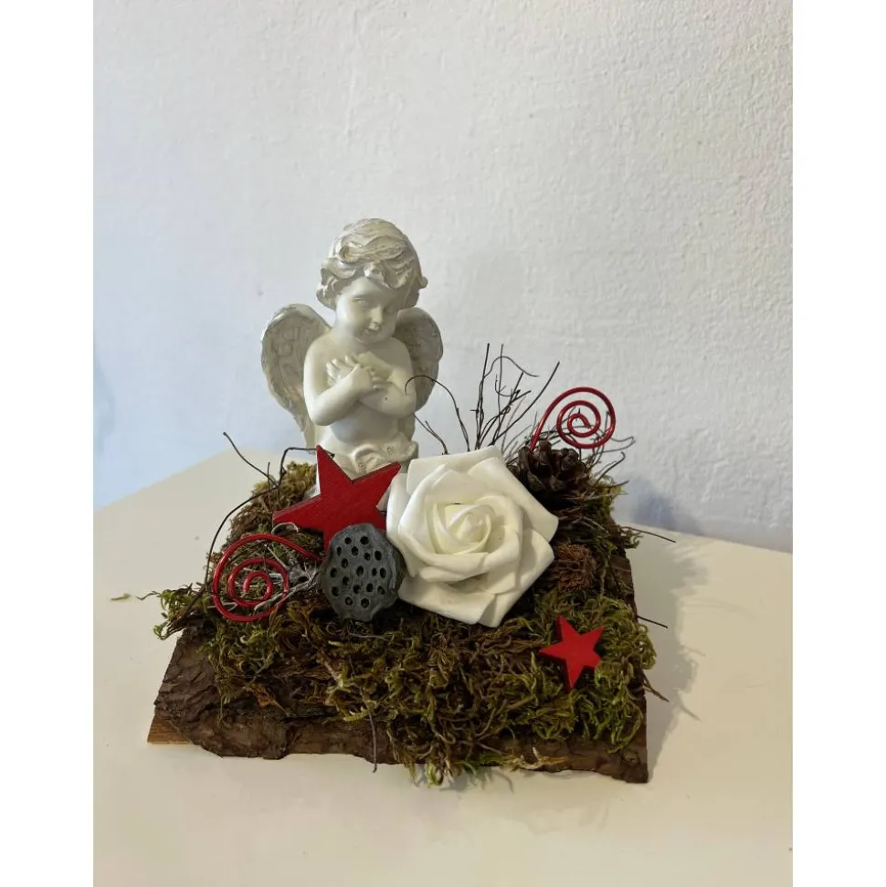 Es besteht aus einem Engel, Schaumstoffrose, getrockneten Moos und weiteren Naturprodukten.