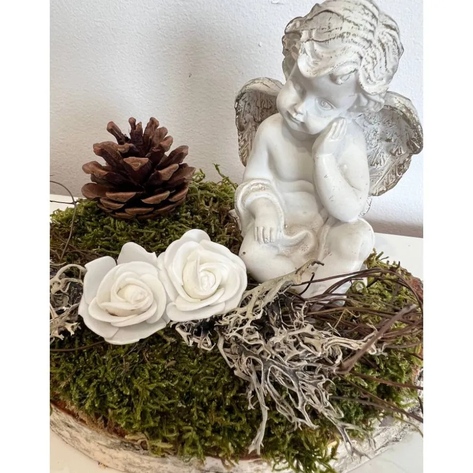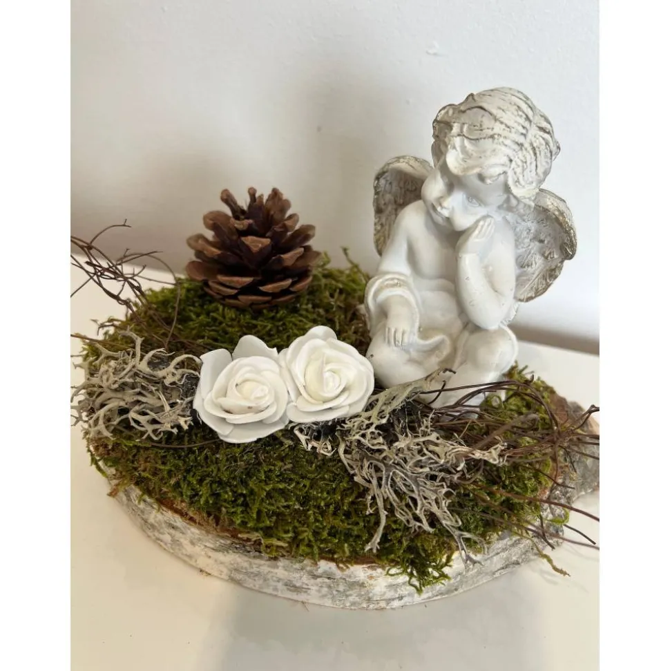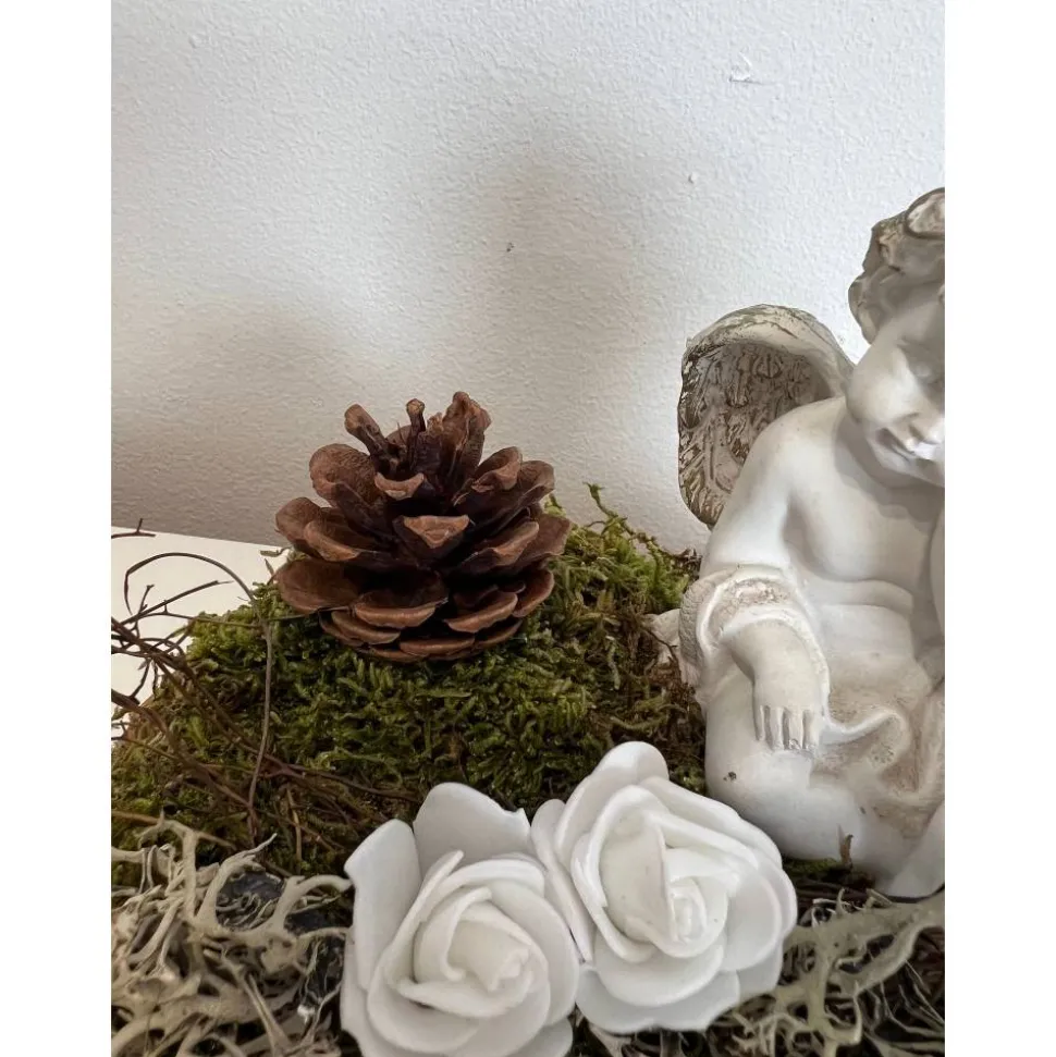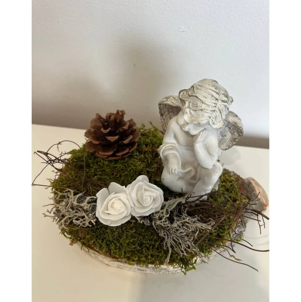 Es besteht aus einem Engel, künstlichen Blumen, getrockneten Moos und weiteren Dekoelementen.