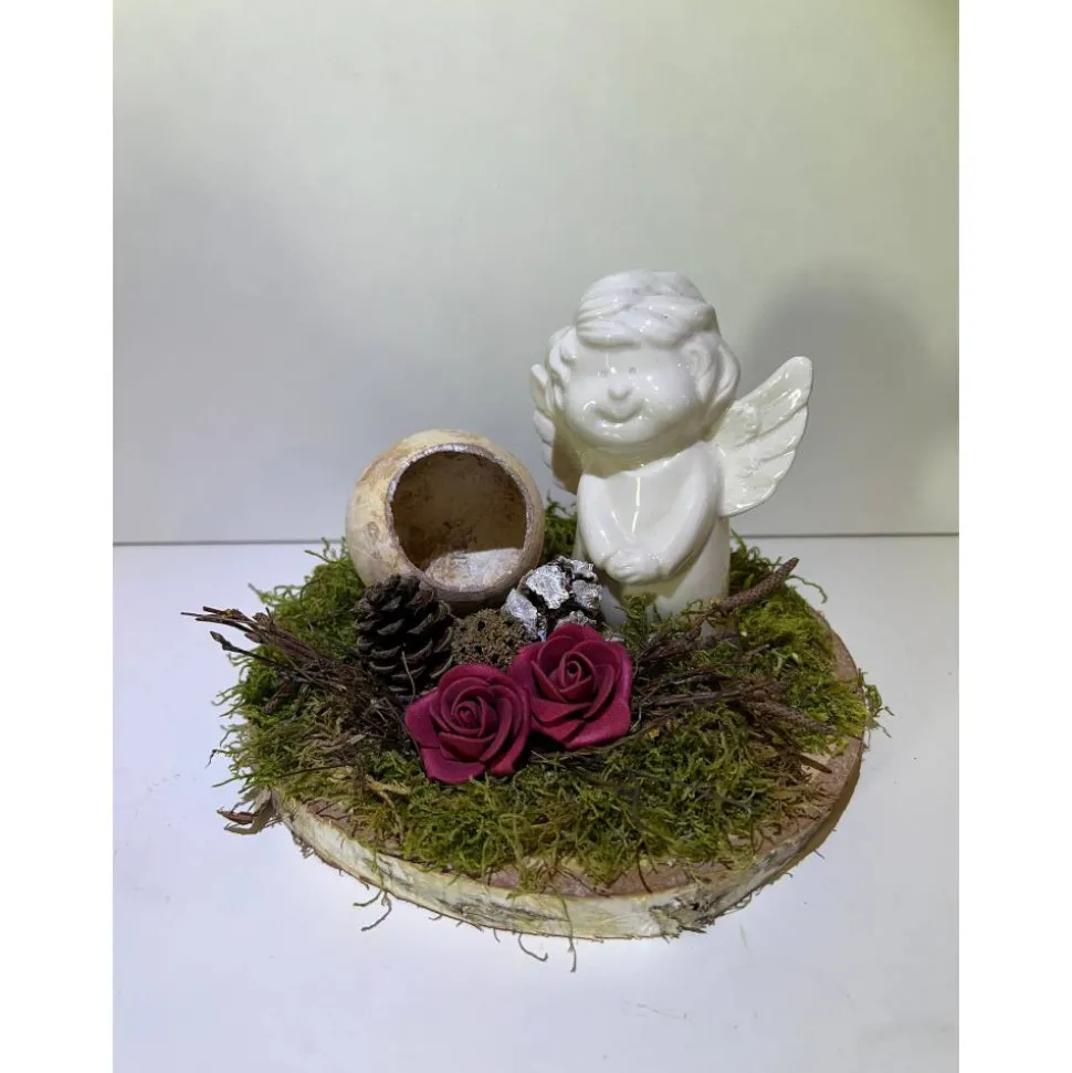 Es besteht aus einem Engel, Blumen, getrockneten Moos und weiteren Naturprodukten.