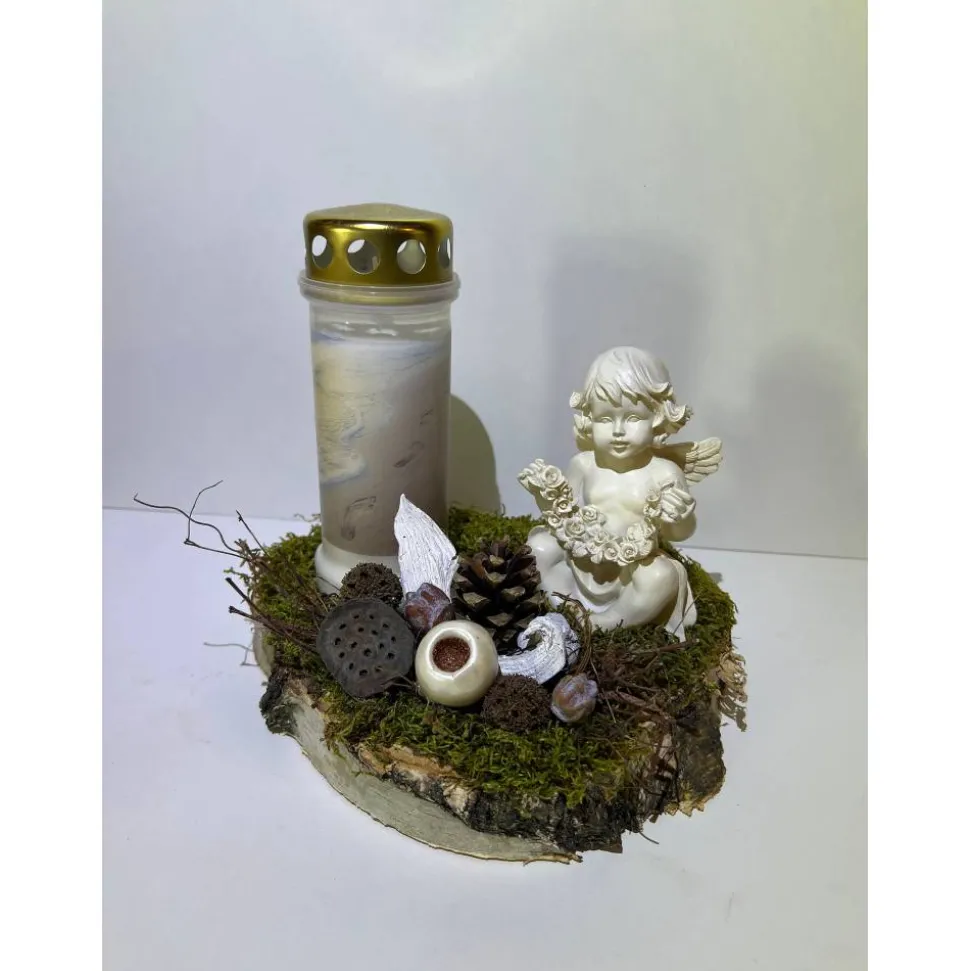 Es besteht aus einem Engel, getrockneten Moos und weiteren Naturprodukten.