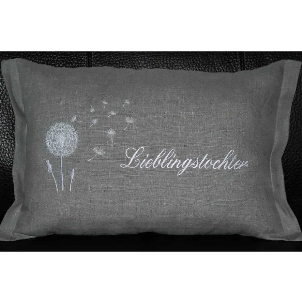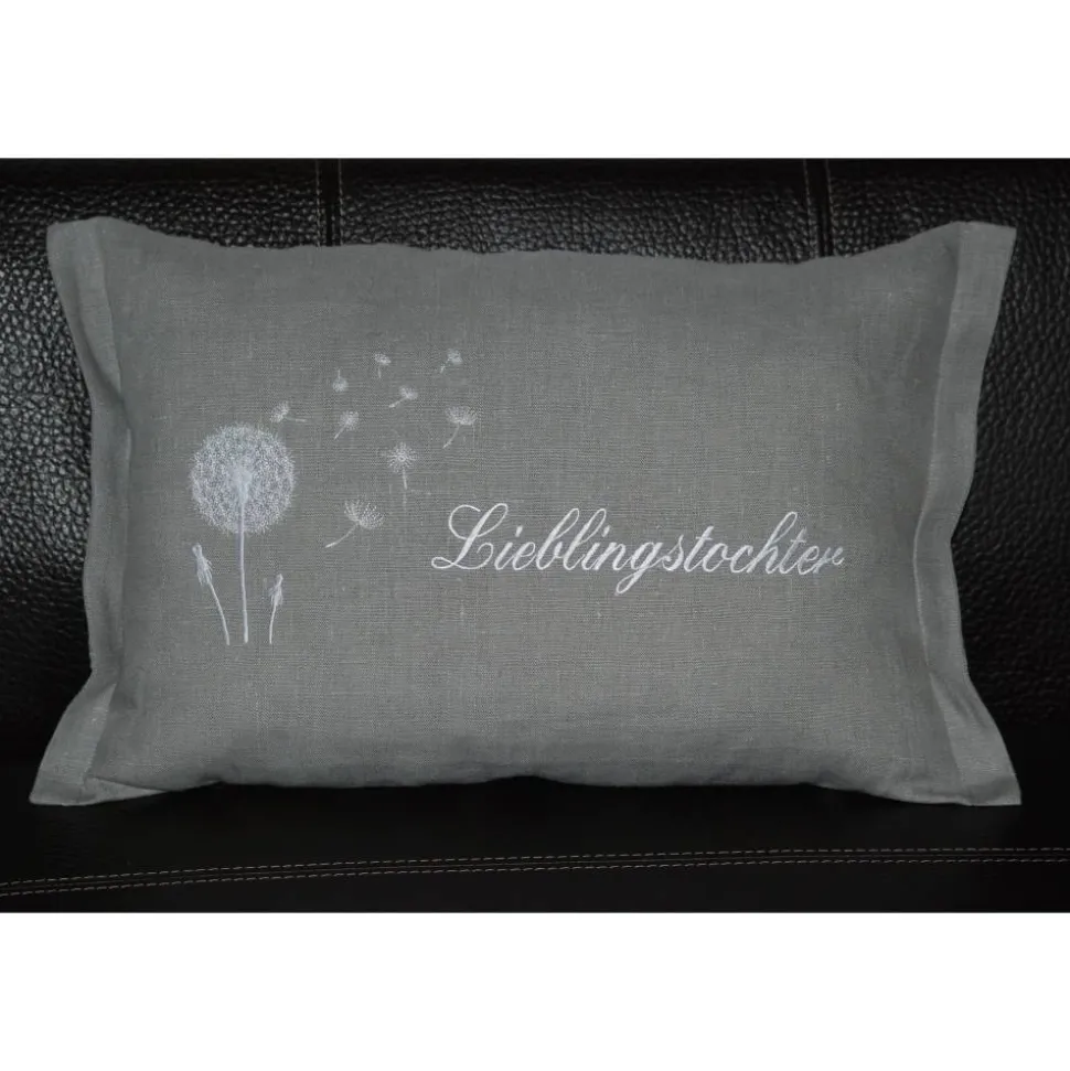 Die Kissen werden mit Ihrem Wunschnamen und Pusteblume in Ihrer Wunschfarbe bestickt.