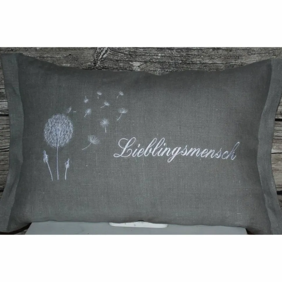Die Kissen werden mit Ihrem Wunschnamen und Pusteblume in Ihrer Wunschfarbe bestickt.