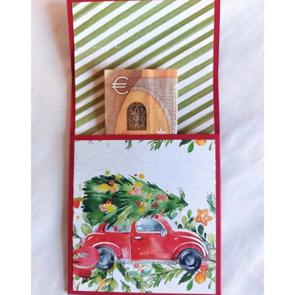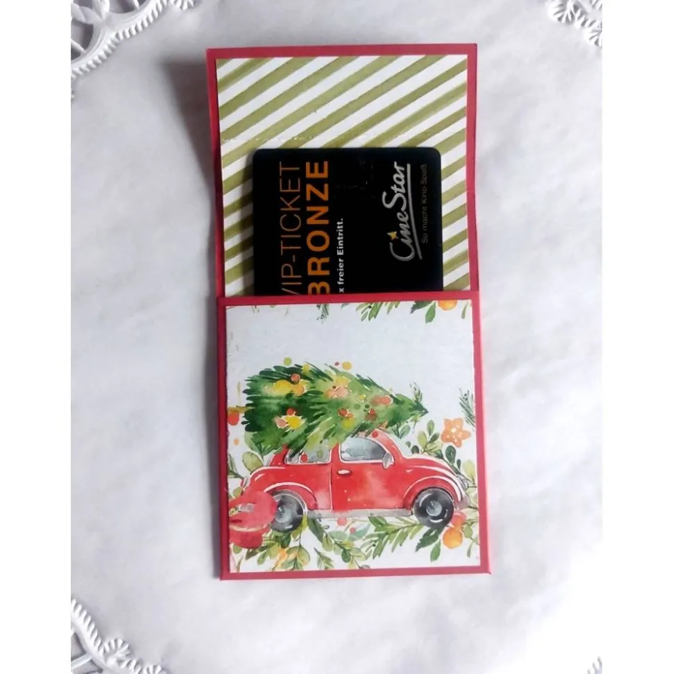 Gefertigt aus rotem Tonkarton und schönem weihnachtlichem Designpapier, hebt man die Klappe an und klappt sie nach oben setzt der Lifteffekt ein und der Geldschein oder der Gutschein konnt zum Vorschein, hinten ist noch Platz um einige persönliche Worte zu schreiben.