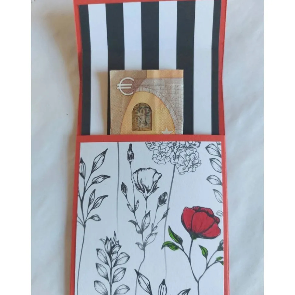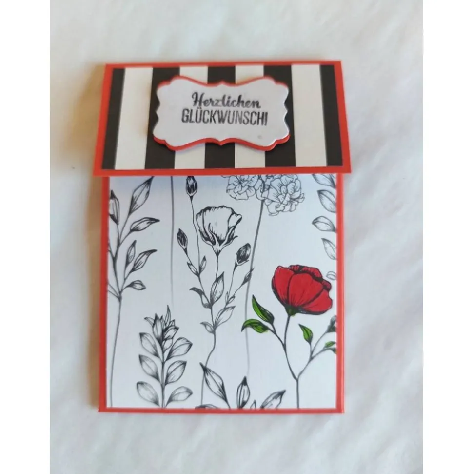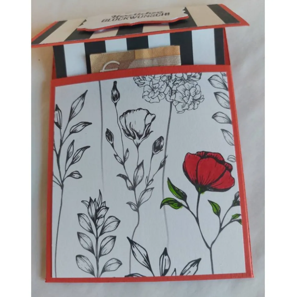 Gefertigt aus rotem Tonkarton und schönem Designpapier, eine Blüte hab ich in rot coleriert. Hebt man die Klappe an und klappt sie nach oben setzt der Lifteffekt ein und der Geldschein oder der Gutschein kommt zum Vorschein, auf der Rückseite ist noch Platz um einige persönliche Worte zu schreiben.