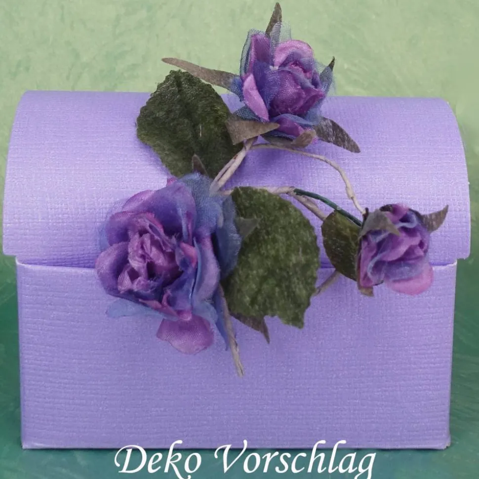 Die fliederfarbene Truhe hat Leinenprägung und schimmert ganz leicht. Sie wird flach verschickt und ist einfach zusammen zu stecken. OHNE BLUMEN!