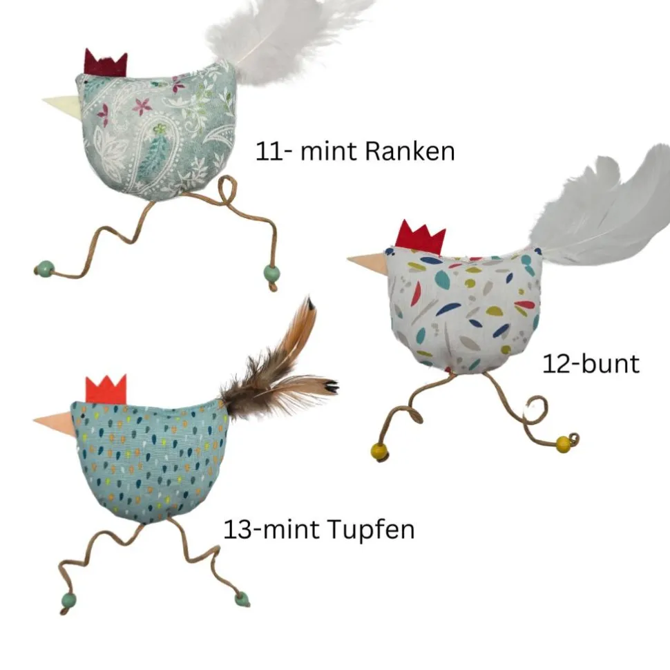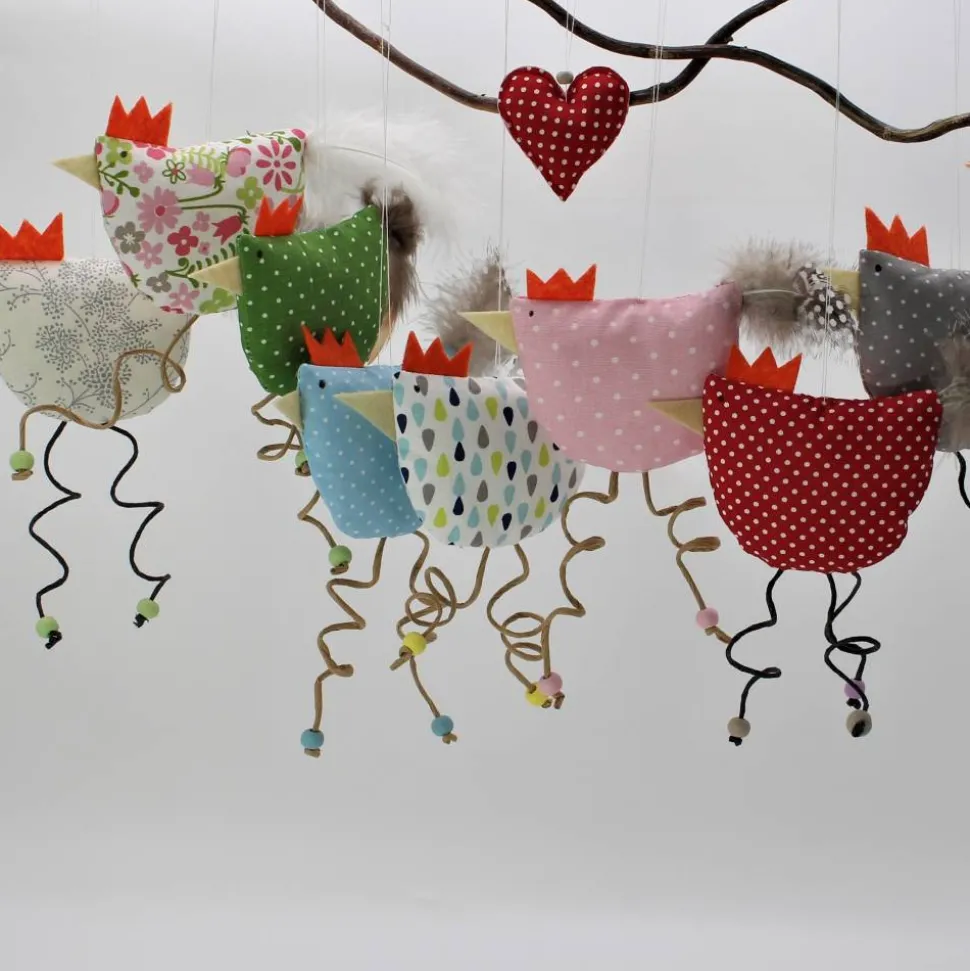 Die Stoffhühner bestehen aus Baumwollstoff, haben Papierdraht als Beine und sind mit schicken Felder geschmückt. Der Schnabel und der Kamm ist aus Filz.
