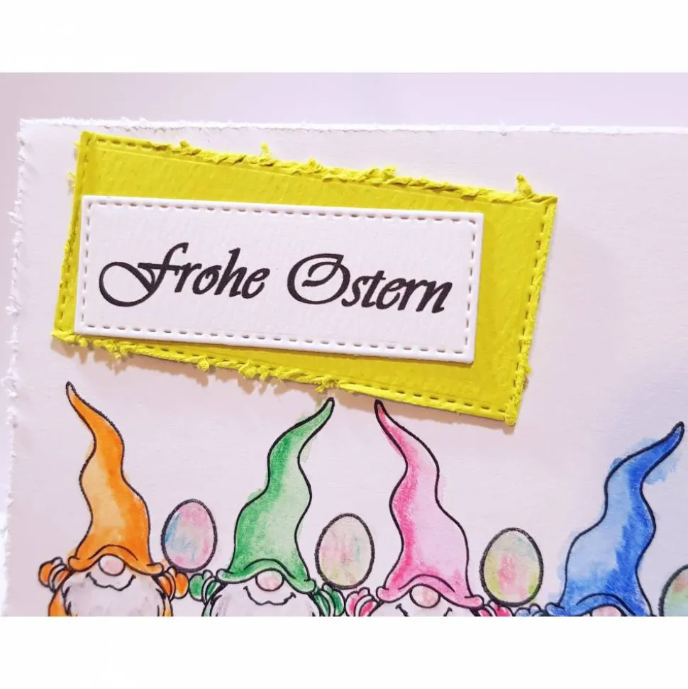 Ich habe sie auf weißen Karton gestempelt und in Pastell-Technik von Hand coloriert, zartes Ostergrün dazu gestempelt und den Ostergruß gestanzt und gedruckt.