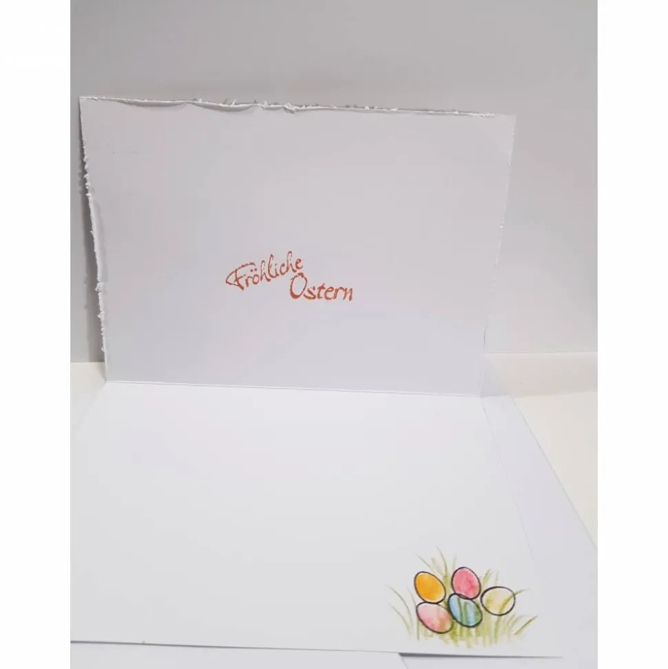 Diese Kartenauflage mit Spezialmesser an den Seiten „gefranst“, auf die Karte geklebt und den Ostergruß aufgebracht.