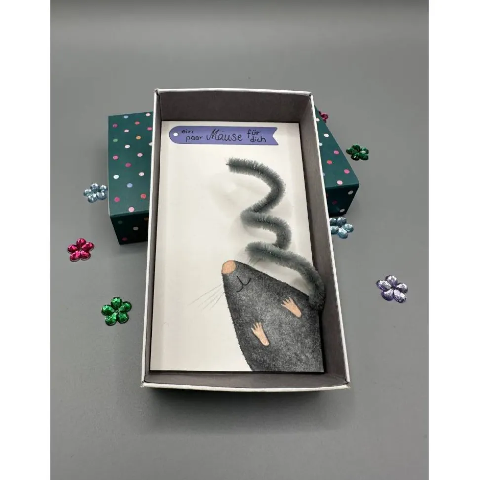 Verschenke Geld mal anders: Mit dem lustigen Geldgeschenk „ein paar Mäuse für dich“ wird jeder Anlass zum Highlight. Statt einfach nur einen Geldschein zu überreichen, steckst du ihn in das graue Mäuseschwänzchen aus Pfeifenputzer, das im Inneren einer liebevoll gestalteten Schiebeschachtel befestigt ist. Die handgemalte Maus blickt dich von unten mit süßer rosa Nase und kleinen Füßchen an – der Geldschein ist raffiniert im Schwänzchen versteckt.