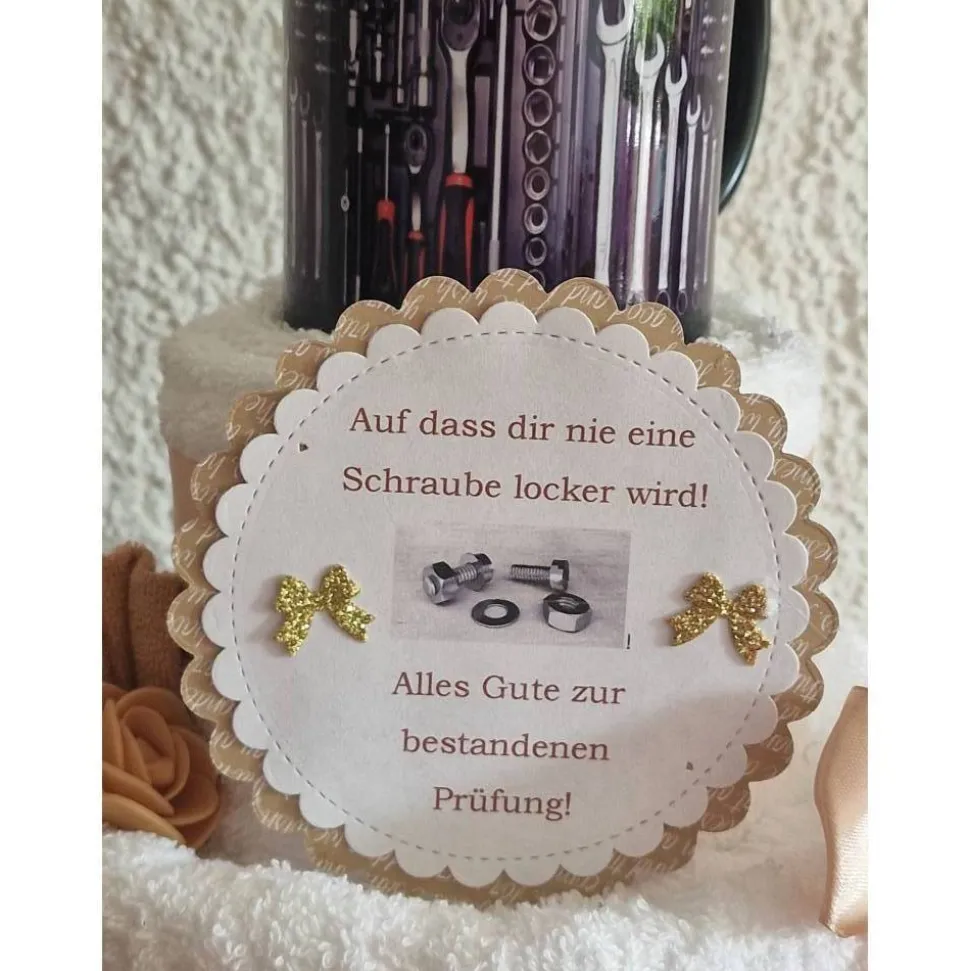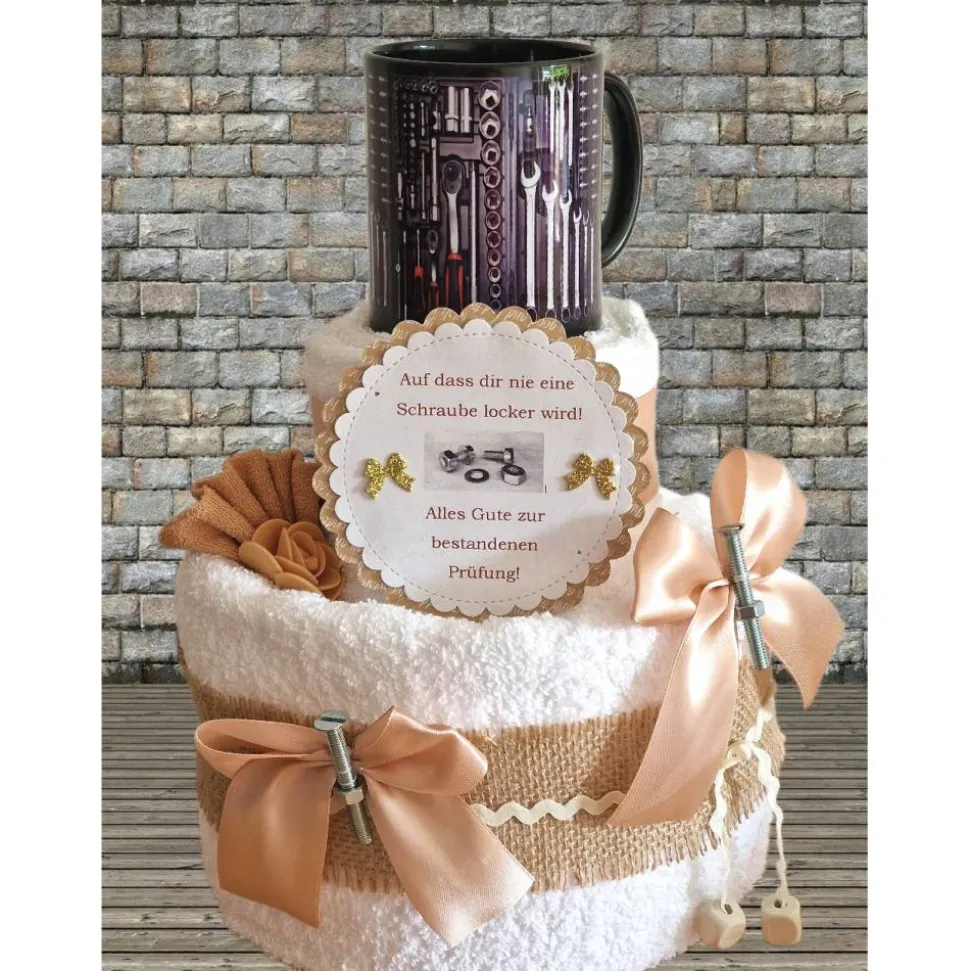 Herzlichen Glückwunsch zur bestandenen Prüfung! Du suchst ein lustiges Geschenk für Männer, um zur Meisterprüfung oder Gesellenprüfung zu gratulieren? Dann ist dieses originelle Set aus Handtuchtorte und witziger Tasse genau das Richtige. Die hübsche Handtuchtorte ist ein echter Hingucker und zugleich praktisch – perfekt zum Feiern und als Erinnerung an den besonderen Tag.