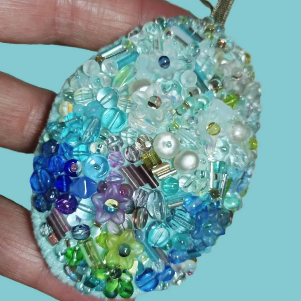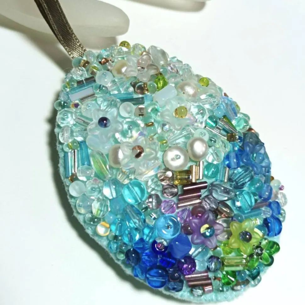 Entdecke ein außergewöhnliches Luxus Osterei: handgefertigt, prachtvoll und detailreich bestickt! Dieses prunkvolle Osterei vereint mint, türkis, blau, lavendel und hellrosa in einer einzigartigen Perlenstickerei. Mit Roccailles aus Glas, antiken Glasperlen, schimmernden Süßwasserzuchtperlen und Blütenperlen wird jede Nuance harmonisch in Szene gesetzt.
