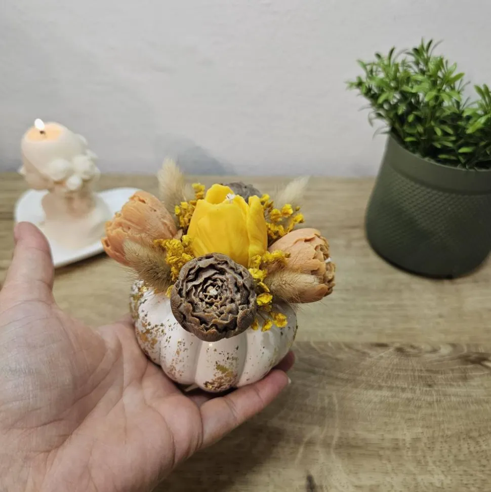 Ich präsentiere eine wunderschöne Komposition aus detailreichen Kerzenblumen (Tulpen & Mohnkapseln) und echten Trockenblumen, arrangiert in einem eleganten, weiß-goldenen Kürbis-Teelichthalter.