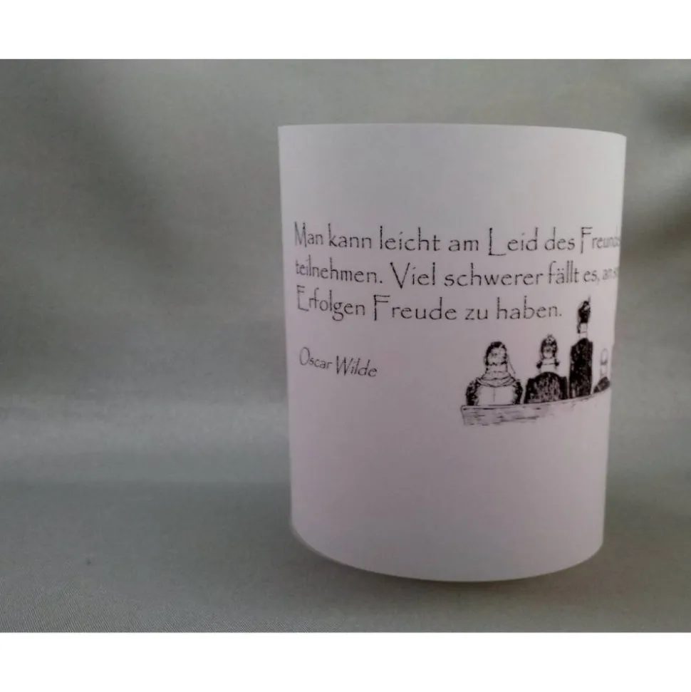 Aus der Windlicht-Serie *“Lyrical Light“* findet Ihr hier die Aphorismen-Edition. „Man kann leicht am Leid des Freundes teilnehmen. Viel schwerer fällt es, an seinen Erfolgen Freude zu haben. – Oscar Wilde“Das Windlicht ist individuell auf sehr festes Transparentpapier gedruckt.Ihr erhaltet das Windlicht fertig vorbereitet und müsst nur noch die beiden Enden mit dem bereits aufgebrachten transparenten Klebestreifen zusammenfügen. Kein Flüssigkleber-Verschmieren!Für alle, die gerne öfter umdekorieren und einfach zu wenig Platz für die vielen schönen Dekoartikel haben, biete ich auch die „mobile“ Windlichtvariante an. Hierbei einfach bei Eurer Bestellung Bescheid geben, dann lasse ich den Klebestreifen weg und Ihr erhaltet stattdessen eine Foldback-Klammer. Mit dieser könnt Ihr das Windlicht zusammenklammern, wenn es zum Einsatz kommen soll. Danach lässt es sich sehr platzsparend (am besten in dem Umschlag, in dem Ihr es von mir erhaltet) aufbewahren.Egal ob nun mit Klebestreifen oder Klammer: zusammenheften, Teelicht oder LED-Licht hinein und viel Freude mit Eurem „Lyrical Light“! *Individualisierungsoptionen* Du hast selbst ein schönes Gedicht oder einen witzigen Spruch, den Du gerne als Windlicht dekorativ in Szene setzen oder den Du verschenken möchtest? Für Dein Fest/ Deine Hochzeit hast Du eine Windlicht-Idee? Melde Dich einfach unter ! 🙂 *Herstellungsart* Druck auf Transparentpapier- mit Herz, Hand und Verstand gefertigt. *Verwendete Materialien* Transparentpapier 150g/qmDoppelseitiges Klebeband transparent *Größe/Maße/Gewicht* Höhe: 10,5 cmDurchmesser: ca. 9 cm
