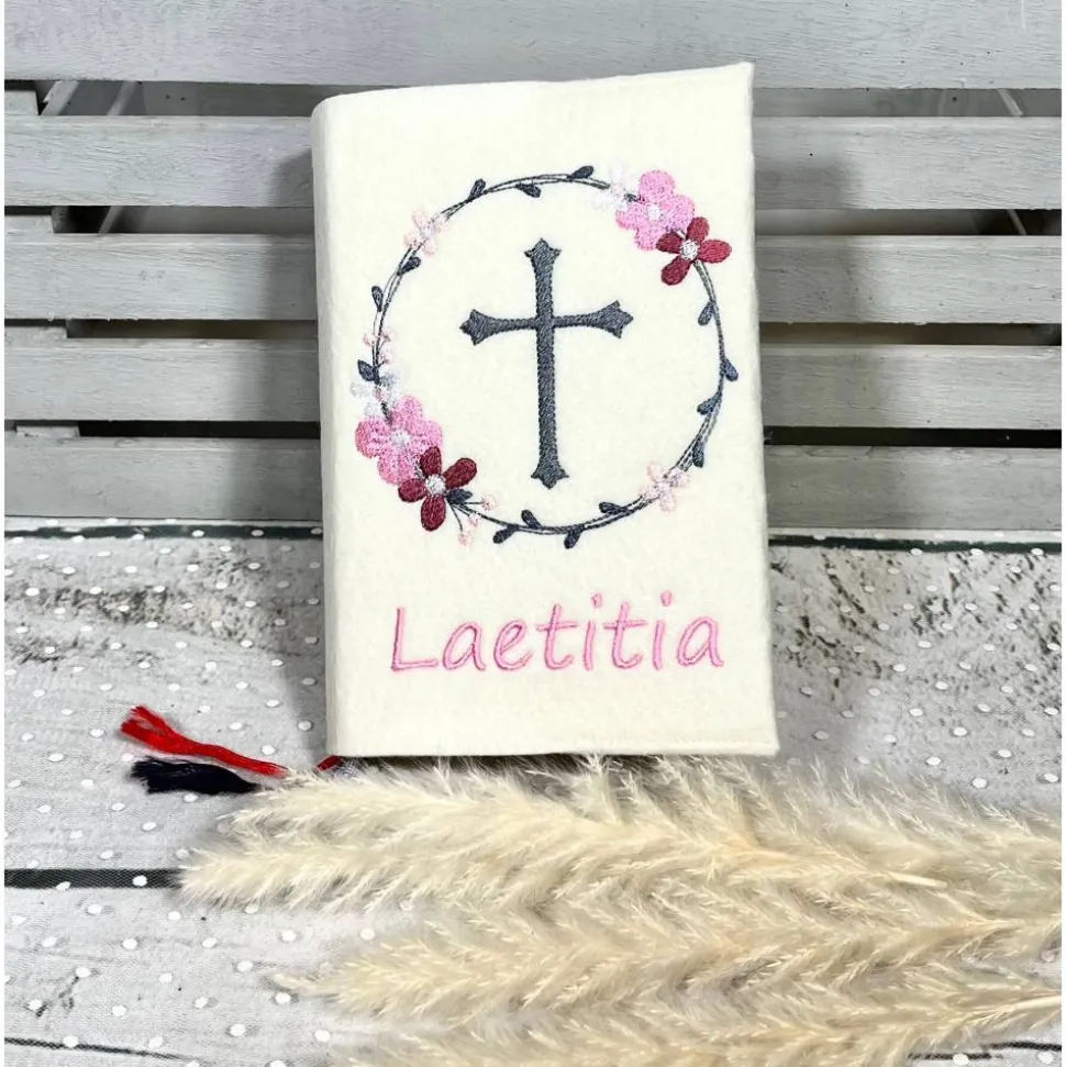 ♥ Liebevoll gestaltete Gotteslobhülle/Gebetsbuchhülle aus Filz mit Blütenkranz / Blumenkranz, Kreuz und Name ♥