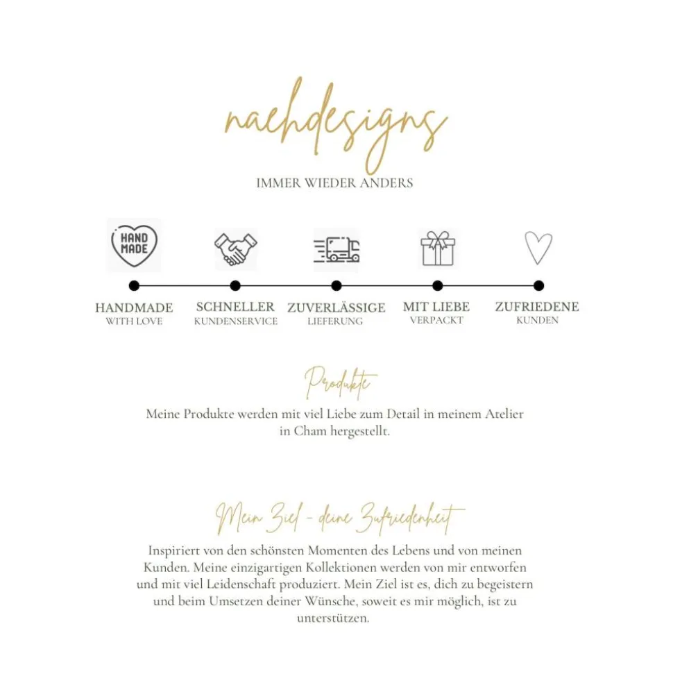Inspiriert von den schönsten Momenten des Lebens und von meinen Kunden. Meine einzigartigen Kollektionen werden von mir entworfen und mit viel Leidenschaft produziert. Mein Ziel ist es, dich zu begeistern und beim Umsetzen deiner Wünsche soweit es mir möglich ist zu unterstützen. Sonderwünsche aber bitte immer vorab mit mir abklären. Ich versuche diese gern umzusetzen.