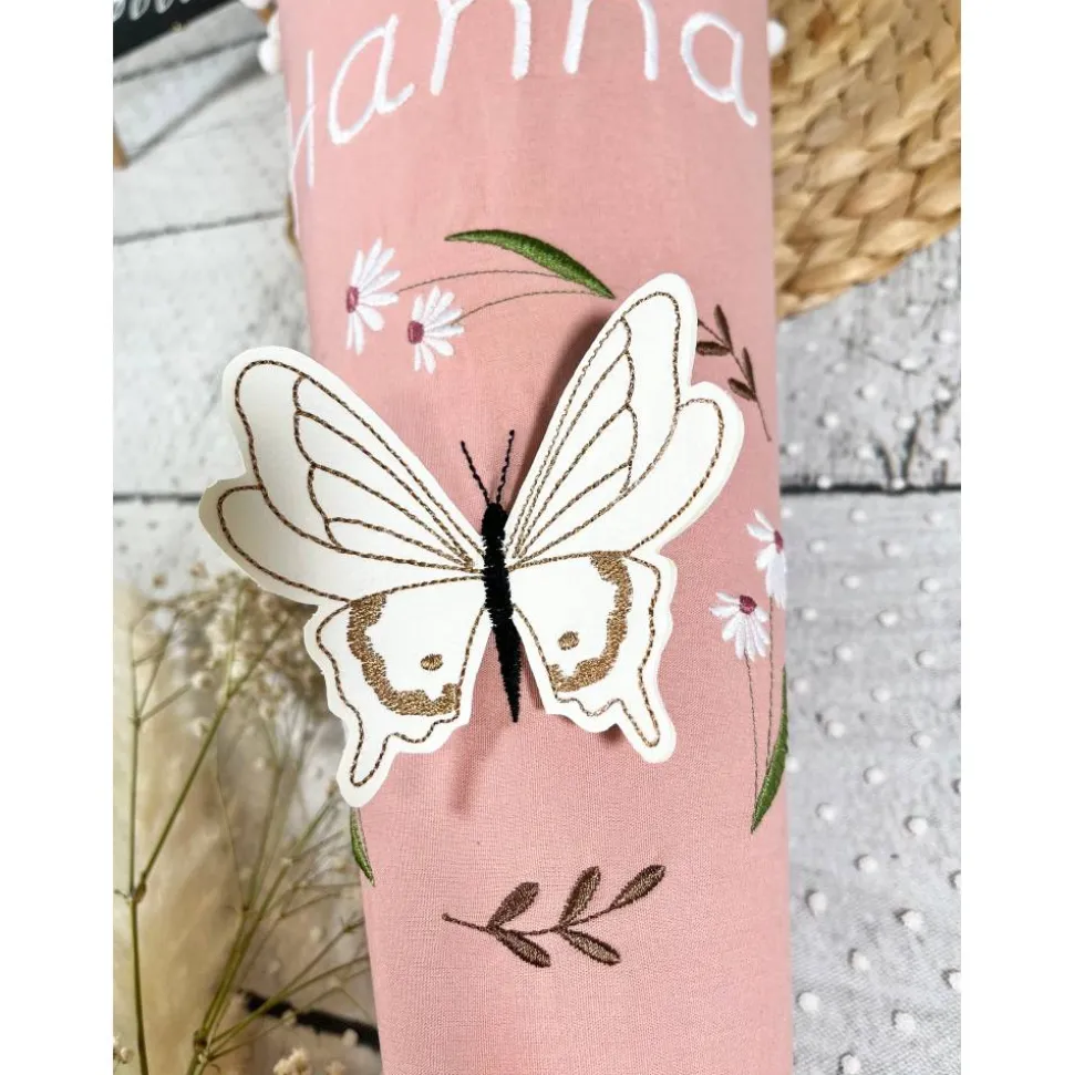 ♥♥ Schultüte Mädchen mit 3D Schmetterling aus weißem Kunstleder im Blütenkranz aus Stoff – gern mit aufgesticktem Namen/Einschuldatum ♥♥