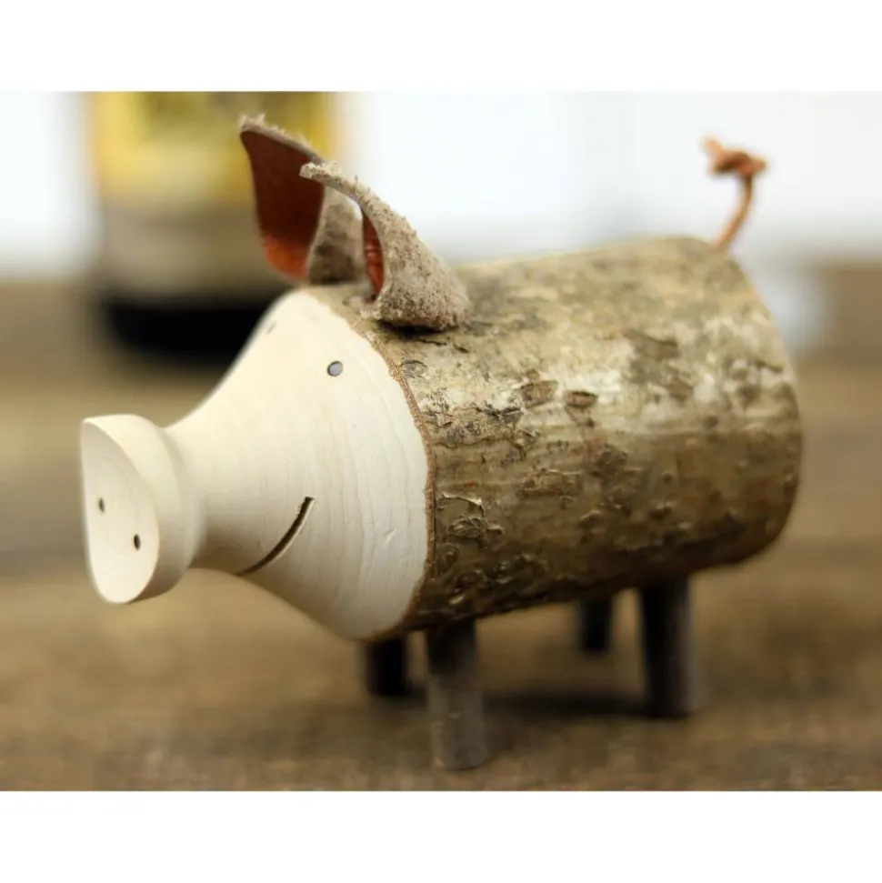 Das Schwein ist mit der Hand aus einem Astholz gedrechselt (Laubholz mit natürlicher Rinde) und mit viel Liebe zum Detail hergestellt. Jedes Exemplar ist ein einzigartiges Unikat aus dem Wald.