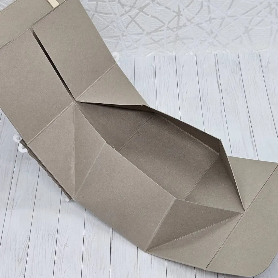 Jede Box wird von Hand aus stabilem 300 g/qm Fotokarton in einem warmen Naturton gefertigt. Die Box misst ca. 10 cm Breite, 5 cm Höhe und 6 cm Tiefe.