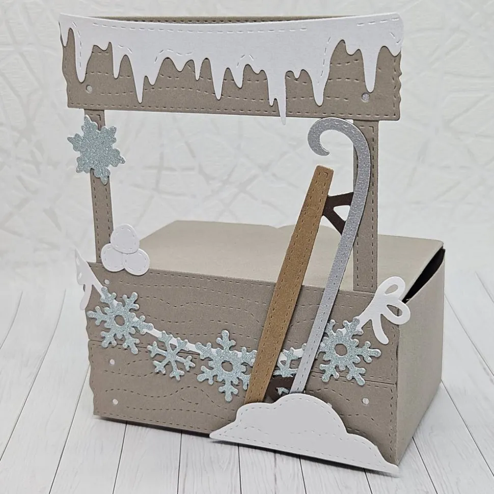 Die dekorative Front (ca. 13 cm hoch und 10 cm breit) ist mit einer Schneeschicht auf dem Dach dekoriert, die wie herabhängende Eiszapfen wirkt. Glitzernde Schneeflocken-Elemente schmücken die Seite der Bude.