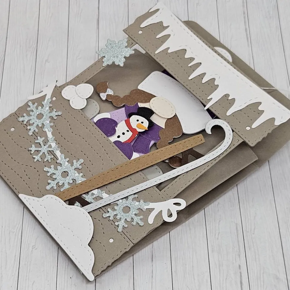 Im Mittelpunkt steht die wunderschöne Wichteline mit geflochtenen Zöpfen, die eine dicke, lila Mütze und ein passendes lila Kleid trägt. Sie hält einen kleinen Schneemann im Arm, der ihr ein Lächeln ins Gesicht zaubert. Neben ihr steht die Winter-Ausrüstung: ein Rodelschlitten.