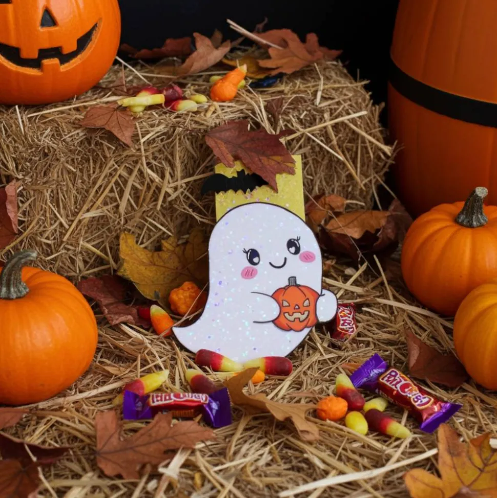 Der kleine Geist ist bereit für Halloween! Mit seinem Kürbis in der Hand spukt er fröhlich durch die Straßen und ruft zusammen mit seinen Freunden „Süßes oder Saures“. Dieses niedliche Motiv begleitet dich beim Lesen und sorgt für herbstliche Stimmung in deinem Buch.