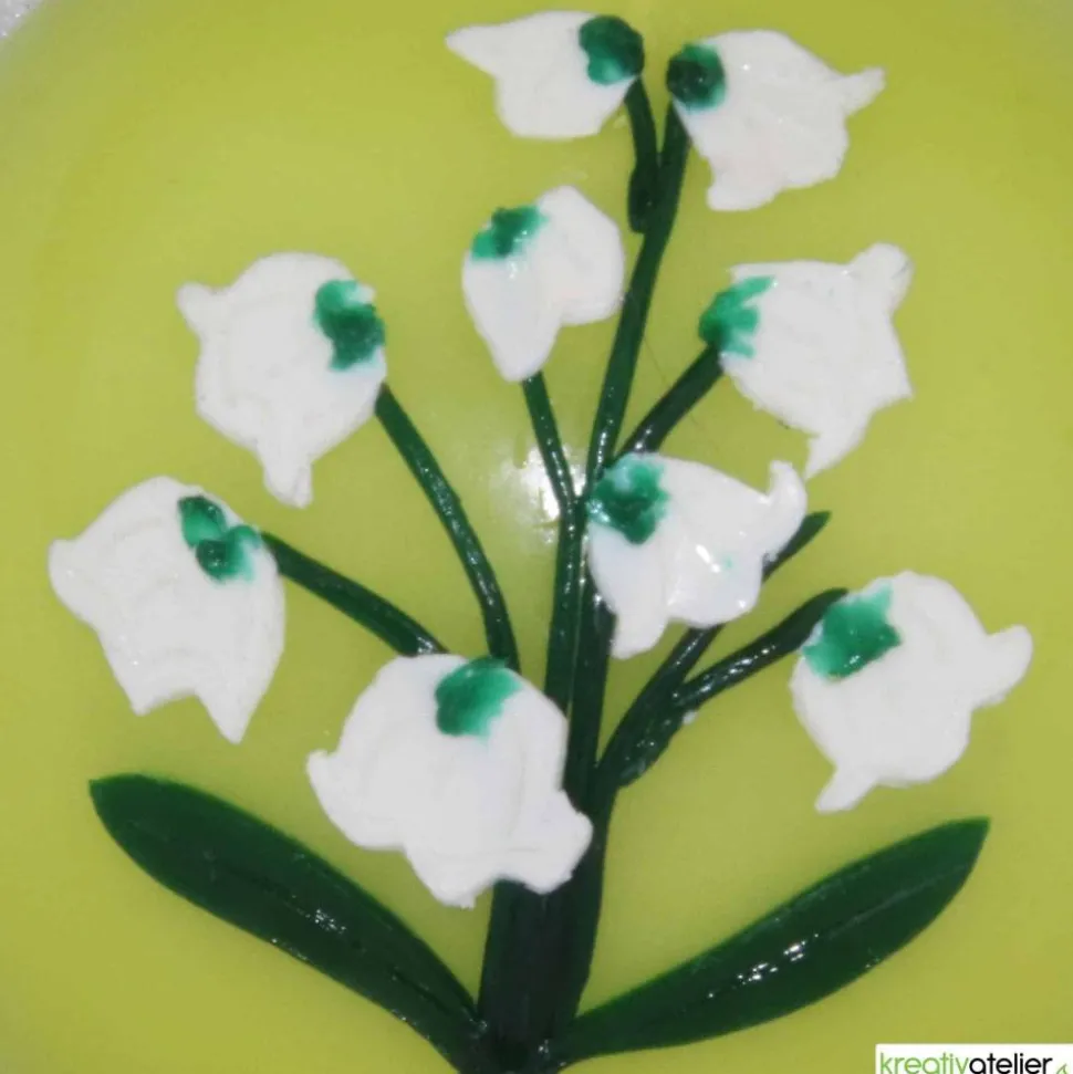Aufwändig und mit Liebe zum Detail ist diese maigrüne Kugelkerze mit einem kleinen Maiglöckchen verziert. Die weißen Blüten, die wie kleine Glöckchen an der Rispe hängen, bestehen aus Wachs und sind alle unterschiedlich groß. Die fröhliche Kerzenfarbe und die lustige Glockenform der Blüten machen Vorfreude auf den Frühling und sorgen für gute Laune.