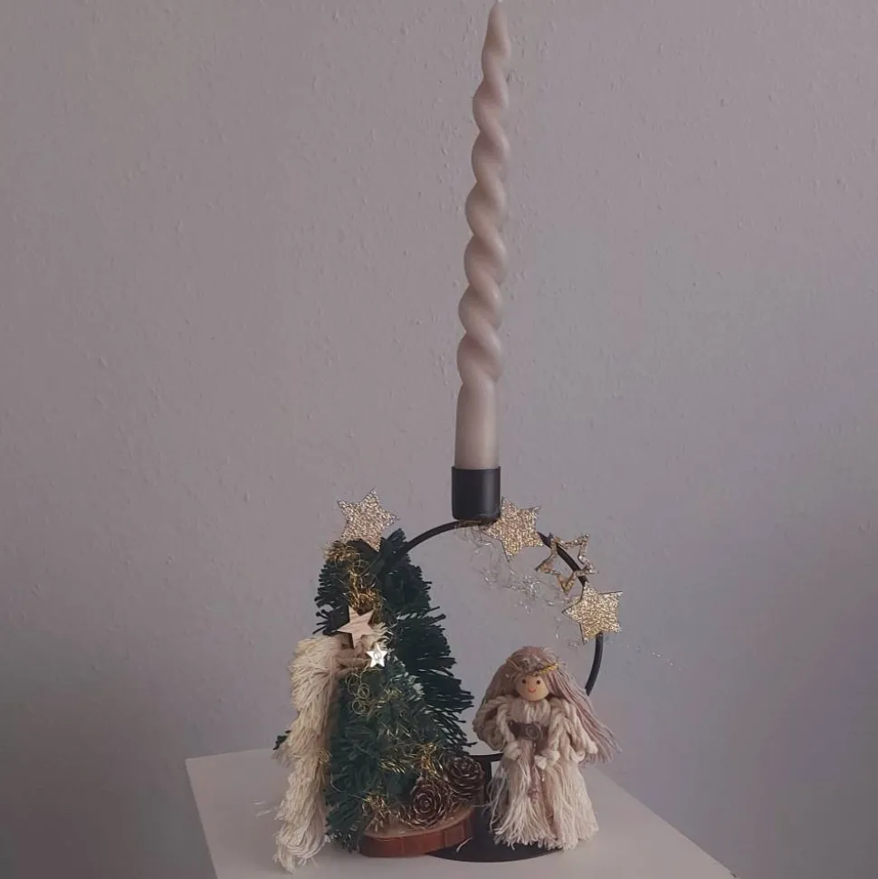 Verleihe deinem Zuhause zur Weihnachtszeit einen ganz besonderen Charme mit diesem einzigartigen Kerzenhalter Weihnachten Makramee. Der Kerzenhalter besteht aus hochwertigem Metall und ist liebevoll dekoriert mit einem handgefertigten Makramee-Engel sowie drei detailreichen Weihnachtsbäumen. Alles ist sorgfältig auf einer natürlichen Holzscheibe arrangiert, was für eine warme und festliche Atmosphäre sorgt.