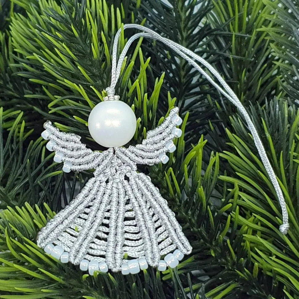 Entdecke einen zarten Makramee Engel in silberfarben – liebevoll von Hand geknüpft aus hochwertiger Nylonschnur. Der kleine Deko-Engel ist mit glänzenden Toho Roccailles und einem schimmernden Acrylköpfchen verziert und besitzt eine praktische Aufhängerschlaufe.